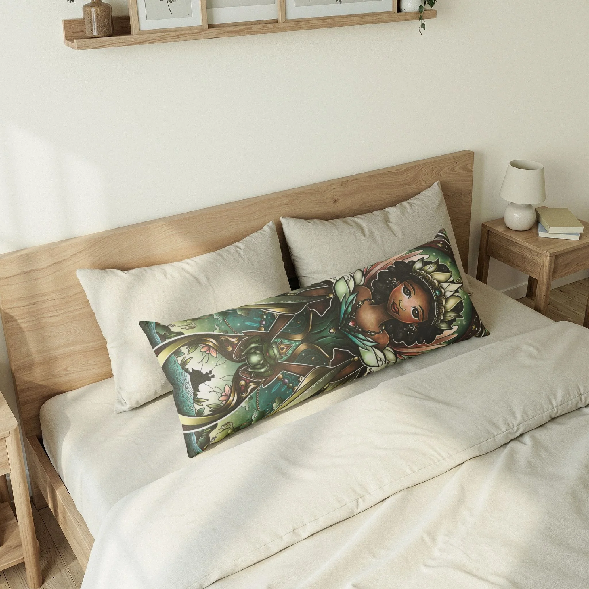 Drift into a sleepy fairytale with this long body pillow that brings the Frog Prince and his princess to life. The artwork reads like a painted storybook—soft brushstrokes, rich greens and golds, a small crown catching the light—so it feels like a quiet scene pulled straight from bedtime tales. Tuck it under your knees during a late-night read, lean back against it on the couch while you revisit childhood stories, or let it sit at the head of a guest bed to add a whimsical touch to the room. For lovers of classic storytelling and hand-painted charm, this pillow adds a layer of warmth and nostalgia without shouting for attention. It’s cozy, slightly romantic, and made to fold into the slow rituals of winding down.