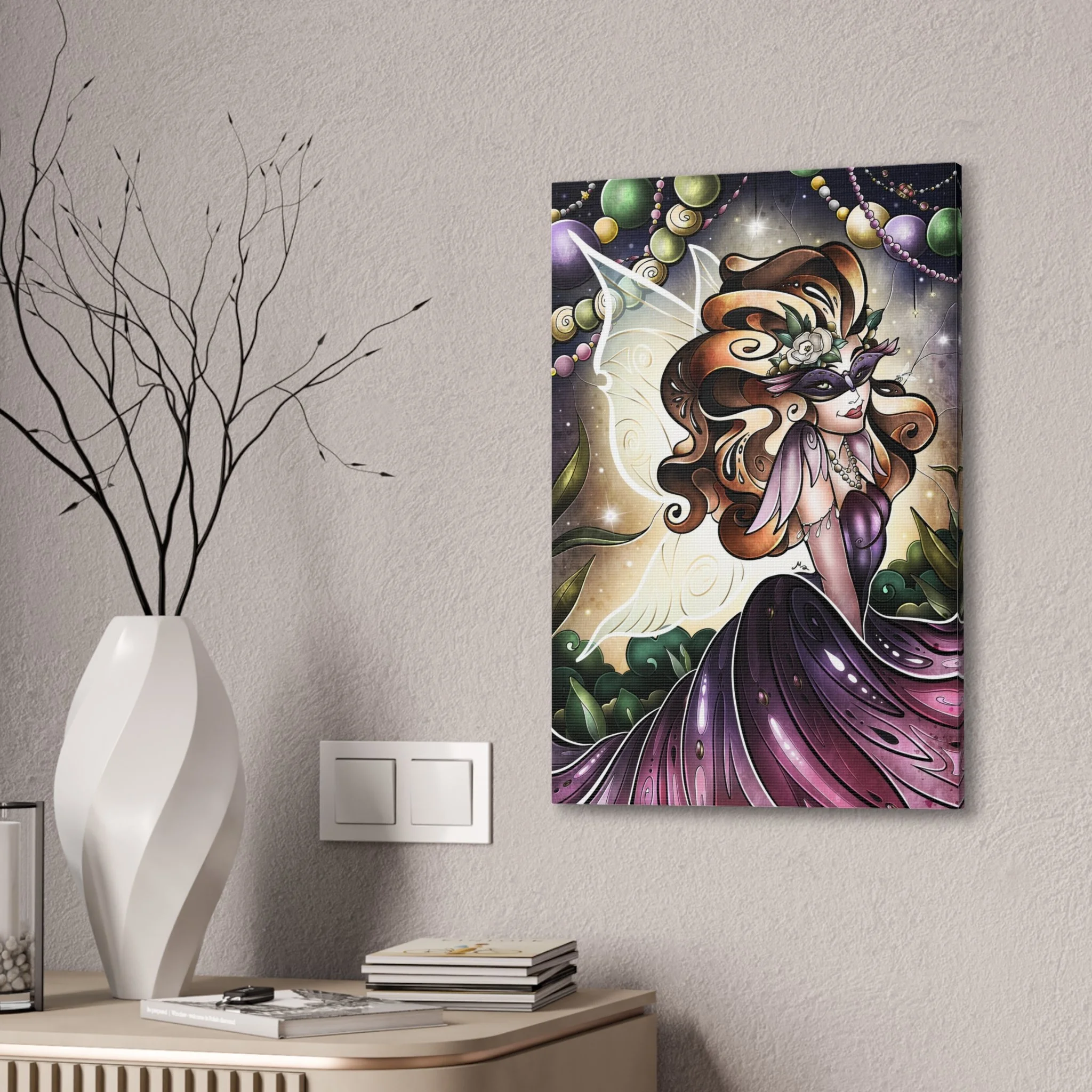 This stretched canvas brings a whimsical, masquerade-night fairy to your wall. The rich purples and warm earth tones are alive with detail — flowing hair, delicate wings, and bead-like orbs that feel both vintage and enchanted. Hung in a cozy reading nook or above a dressing table, the image invites quiet evenings and imaginative escapes. The slim, 0.75" pine frame keeps the scene close to the wall, letting the art feel like a window into a hidden celebration.