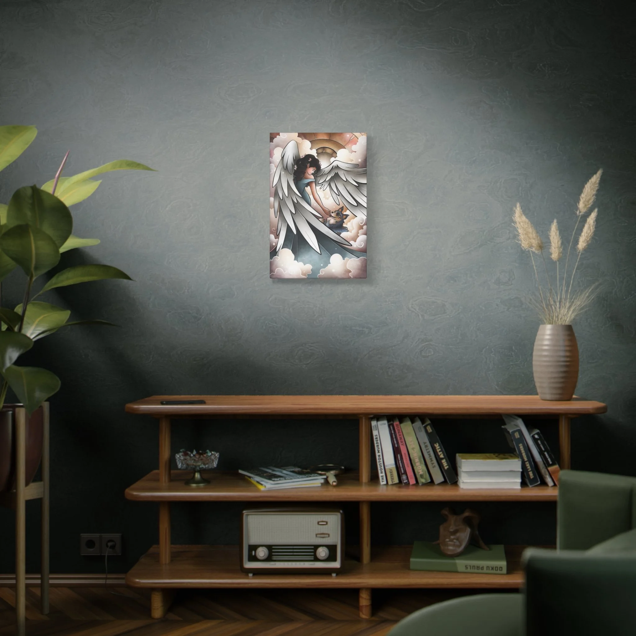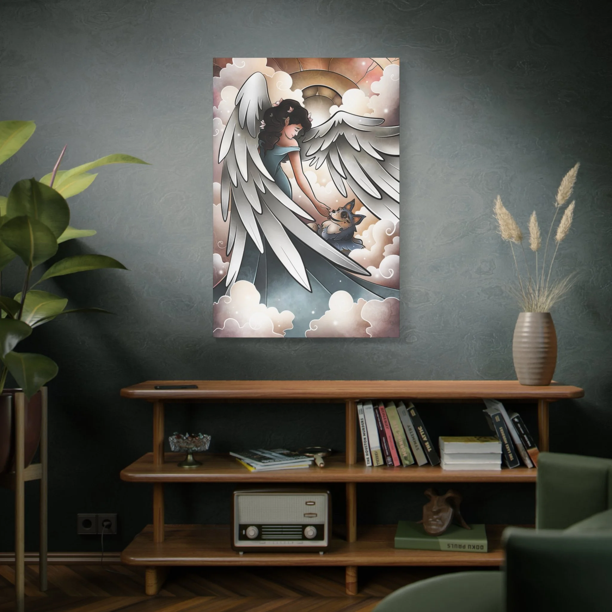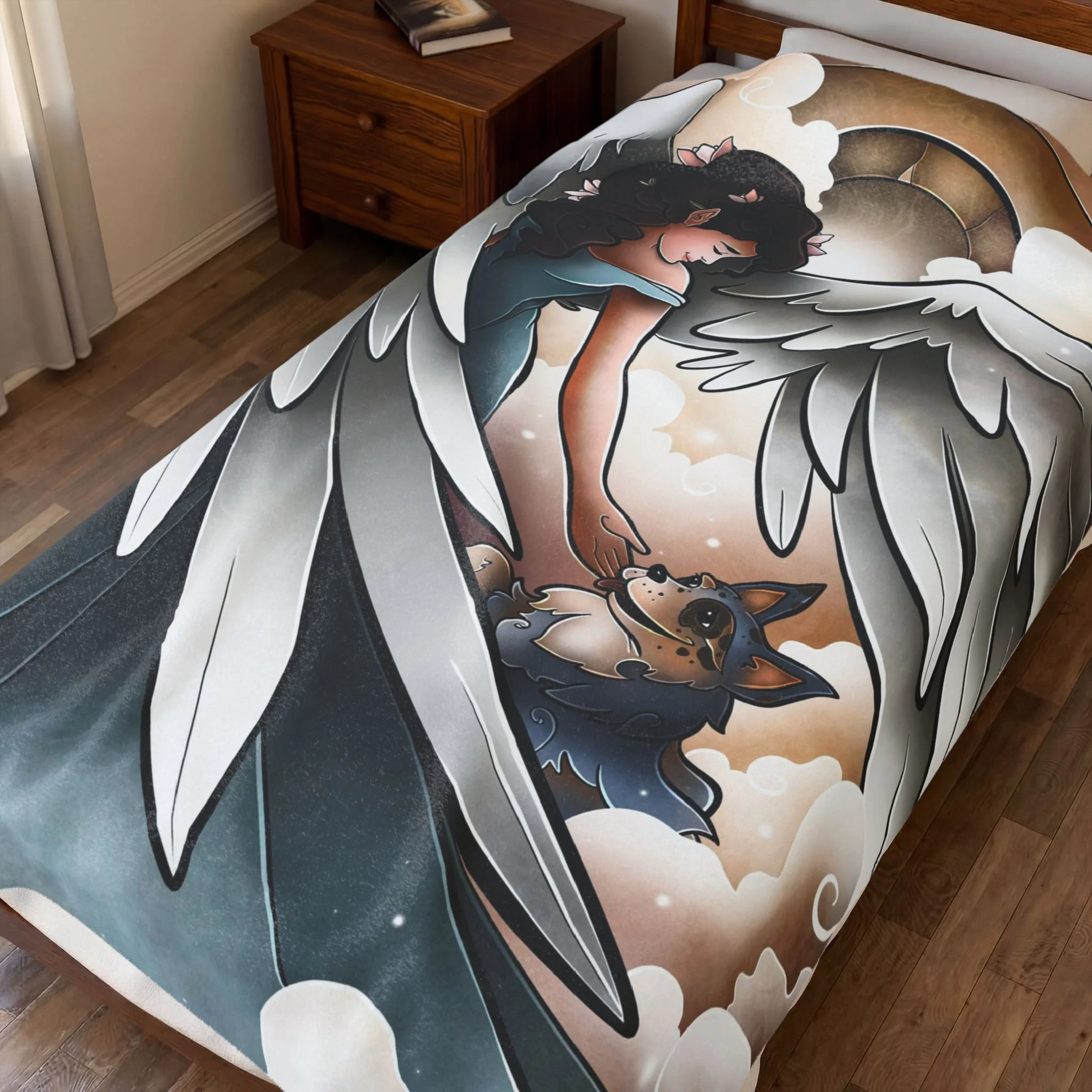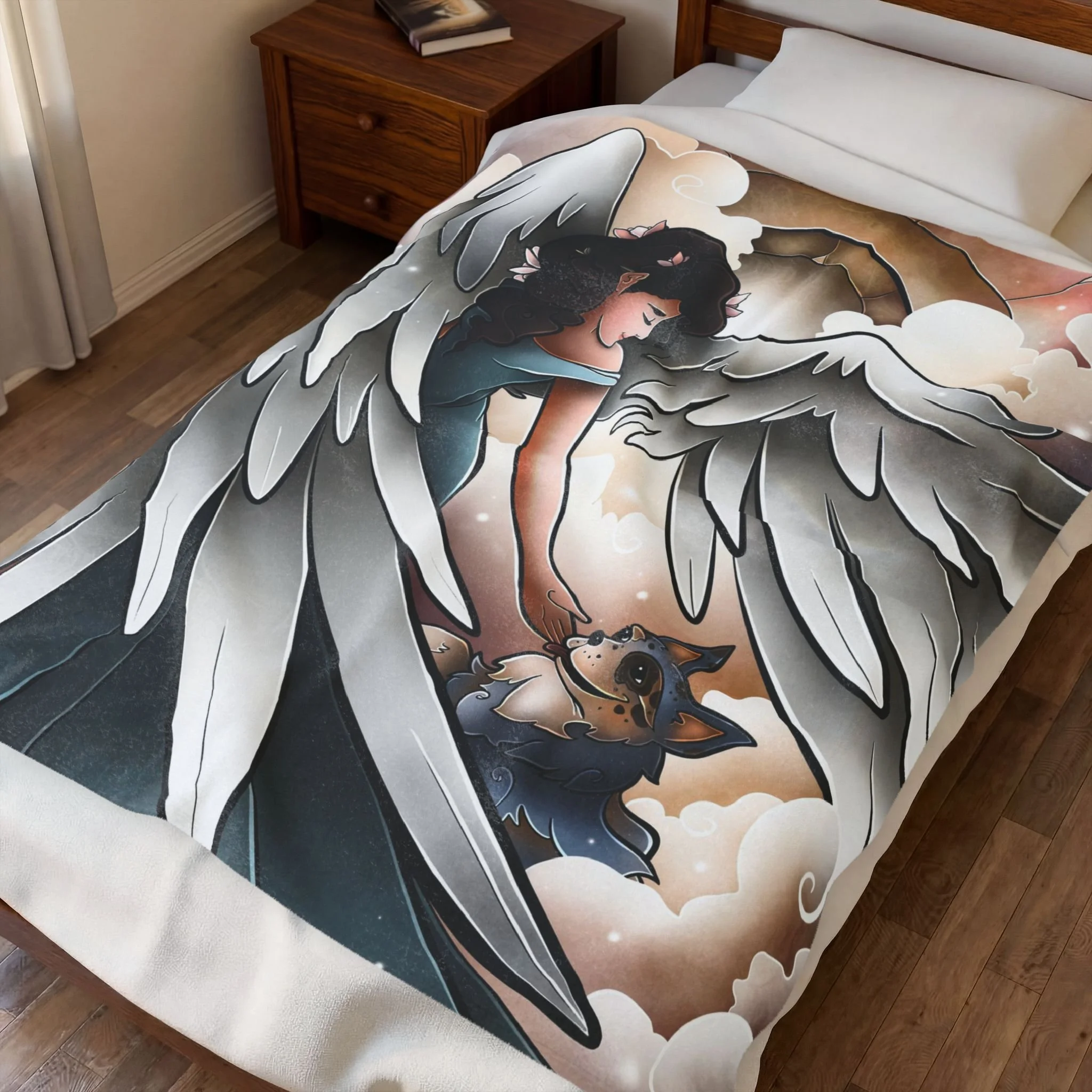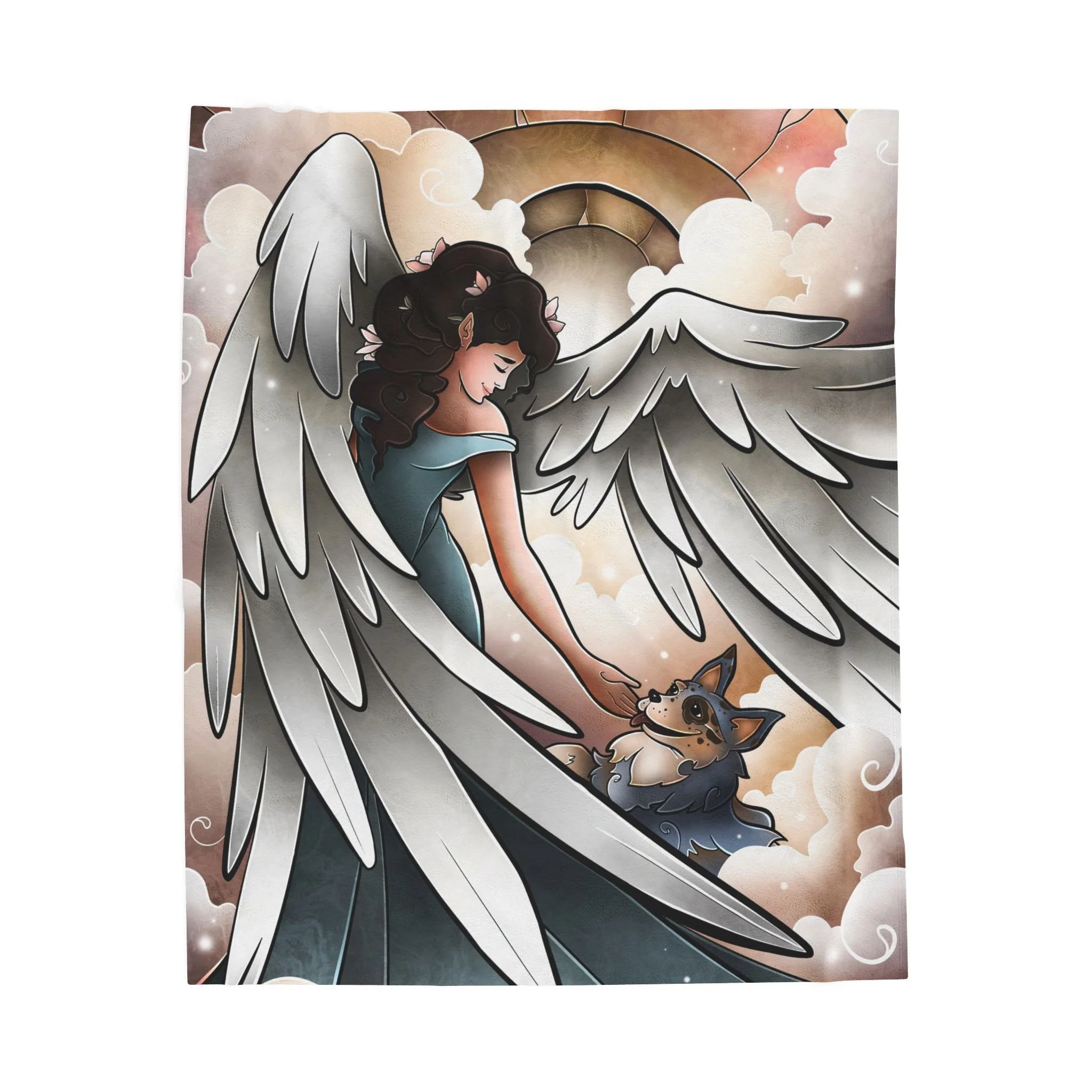 Soft and quiet, this velveteen plush blanket carries a gentle scene meant to soothe. An angel leads a newly arrived dog along pillowy clouds—brushstrokes and soft color bring a hushed, tender moment to life. Wrap this blanket around shoulders during late-night remembrance. It’s a companion for people who keep the memory of a beloved pet close: the design reads like a short lullaby, calming and luminous. Use it on the couch during reflective evenings, drape it over a chair in a cozy reading nook, or keep it near the bed as a quiet comfort during the first nights after loss. The imagery avoids showy sentiment and instead offers a simple, reverent scene that honors the bond between human and dog.