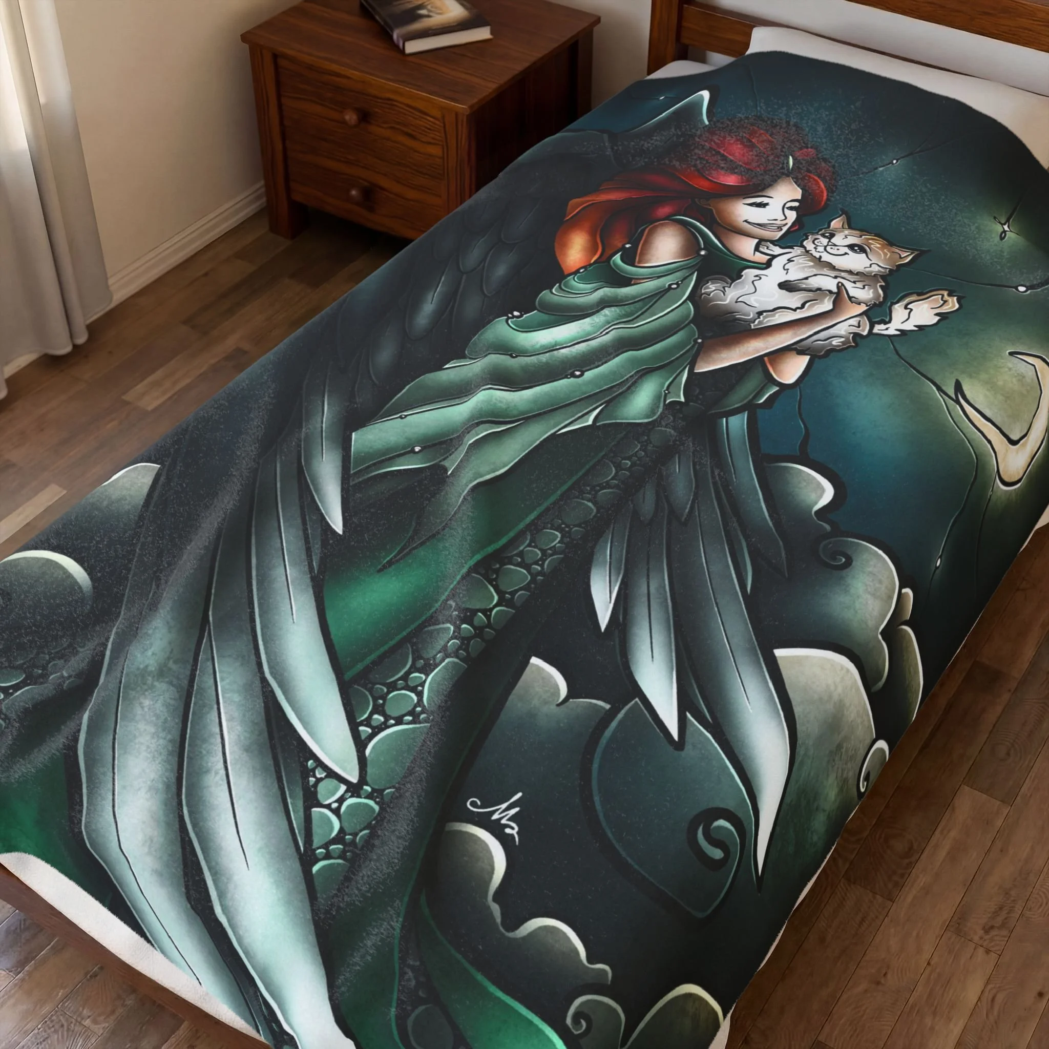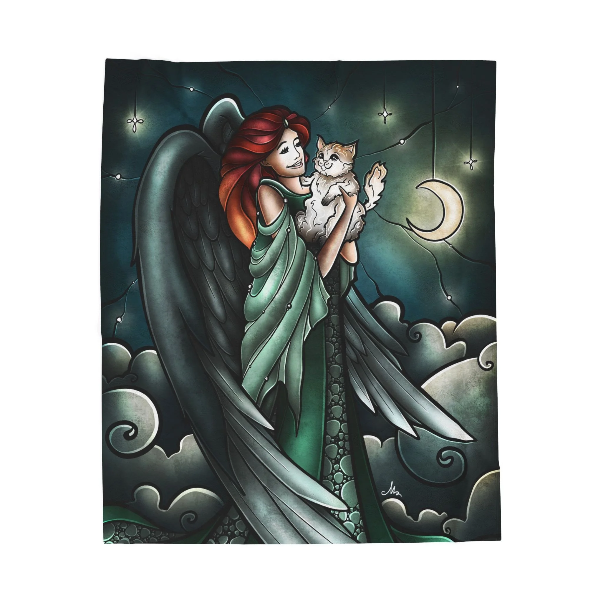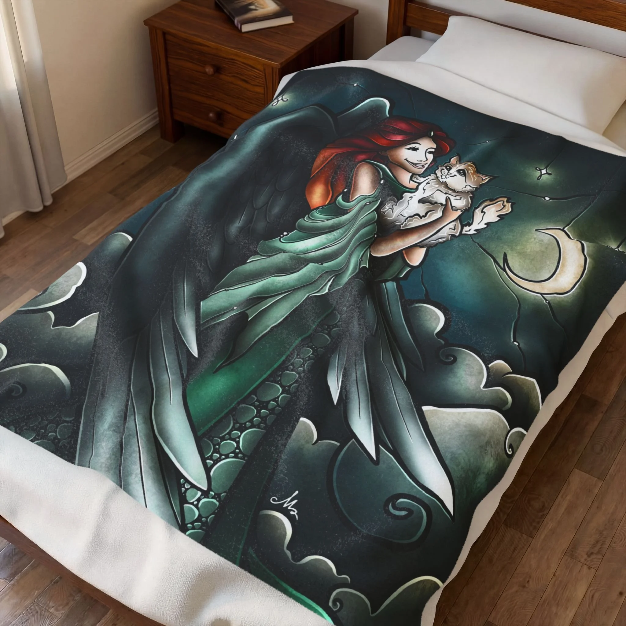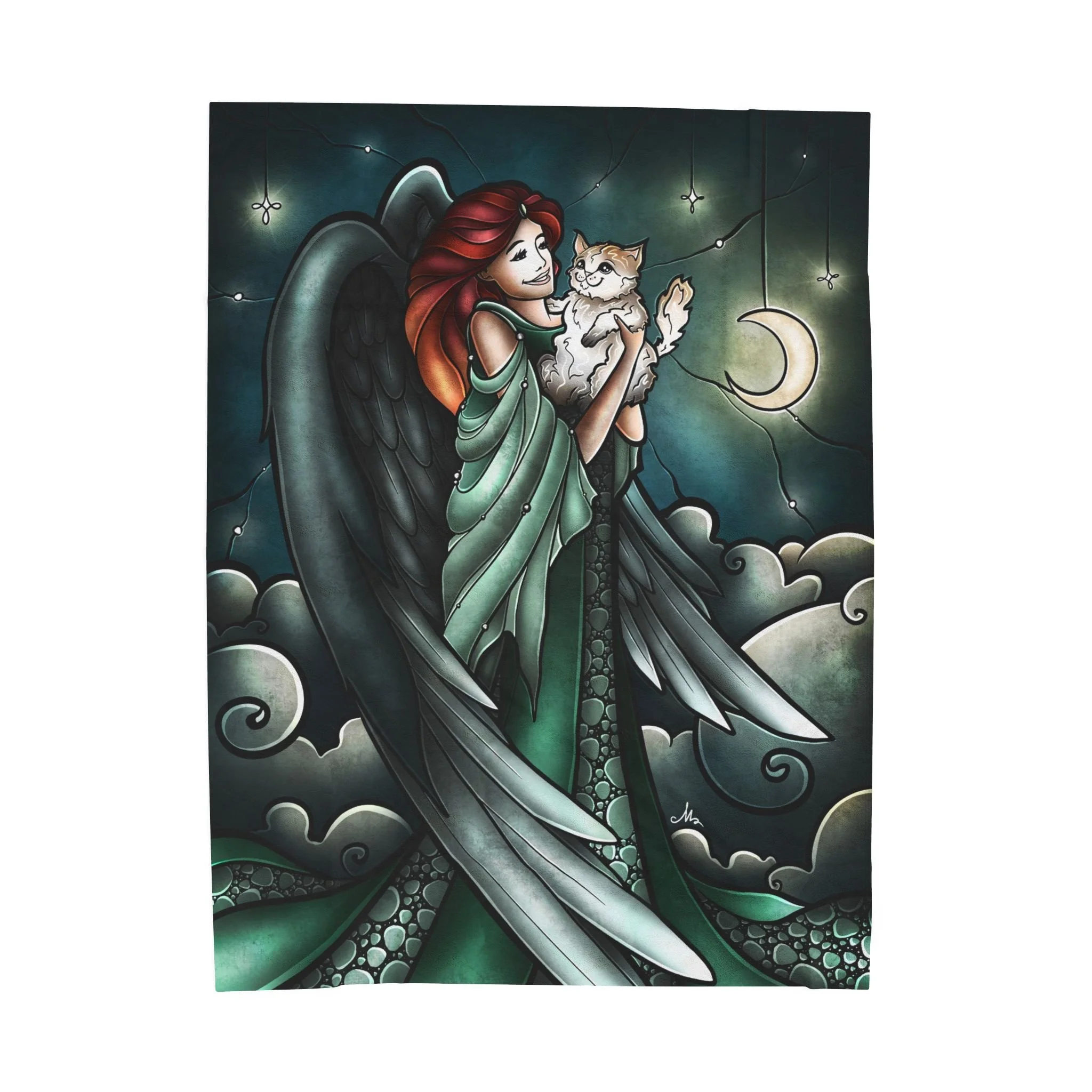 Float into a quiet, tender moment with this velveteen plush blanket. A gentle painting of an angel greeting a cat is printed in vibrant detail on one side, its soft brushstrokes and warm composition inviting quiet reflection. The medium-heavy fabric wraps around like a comforting pause—soft under the chin, plush against the knees—making it easy to curl up with memories or keep close during evenings when you want a subtle reminder of love and loss. For someone navigating grief or honoring a beloved pet, this blanket feels like a small, steady presence: soothing, intimate, and quietly reverent. It drapes beautifully over a favorite chair or across the foot of a bed, bringing a calm, companionable atmosphere to moments of remembrance, memorial gatherings, or quiet nights in.