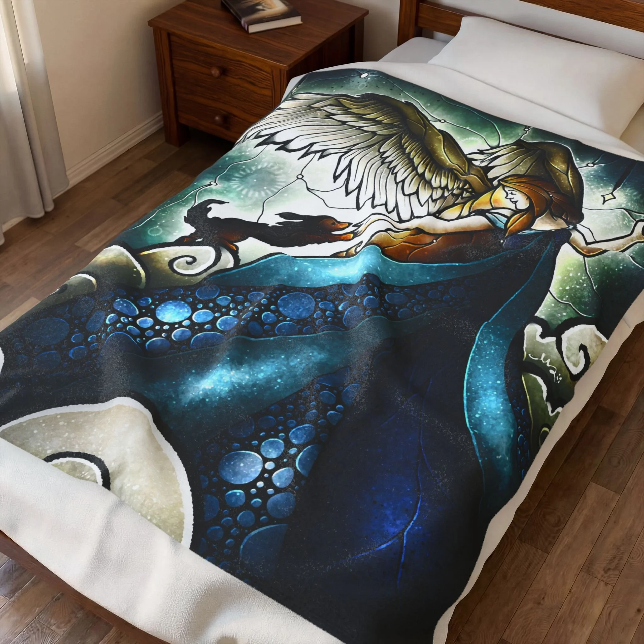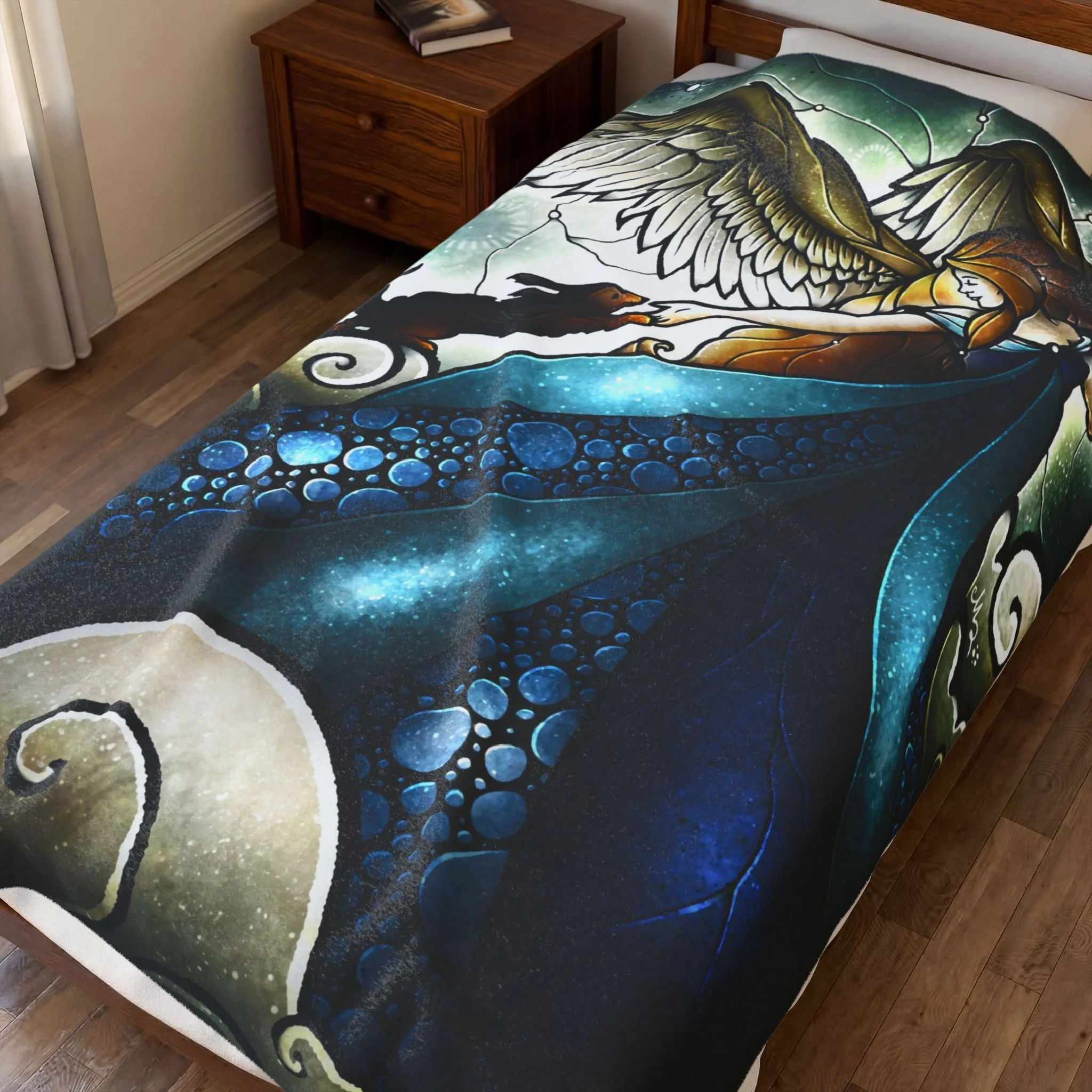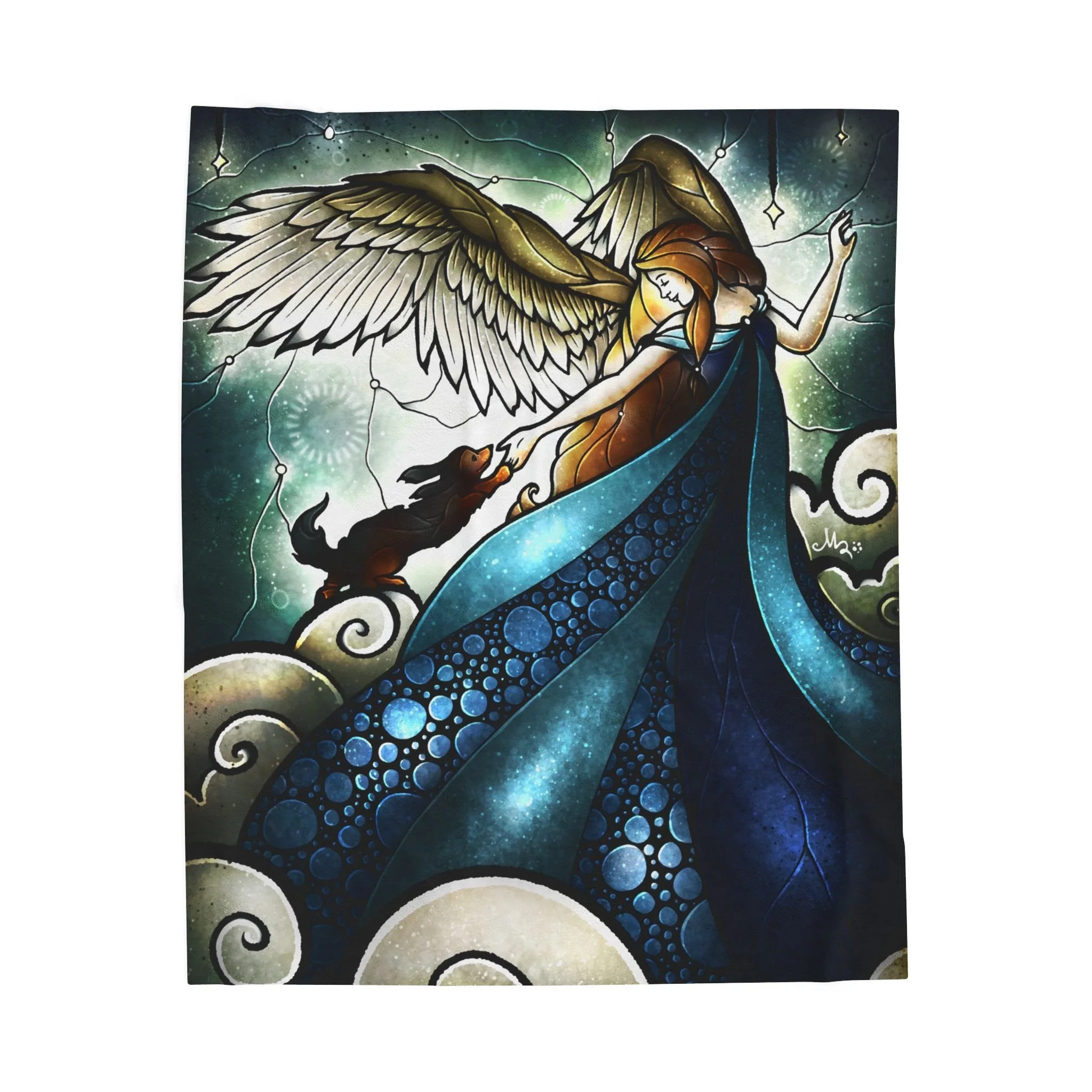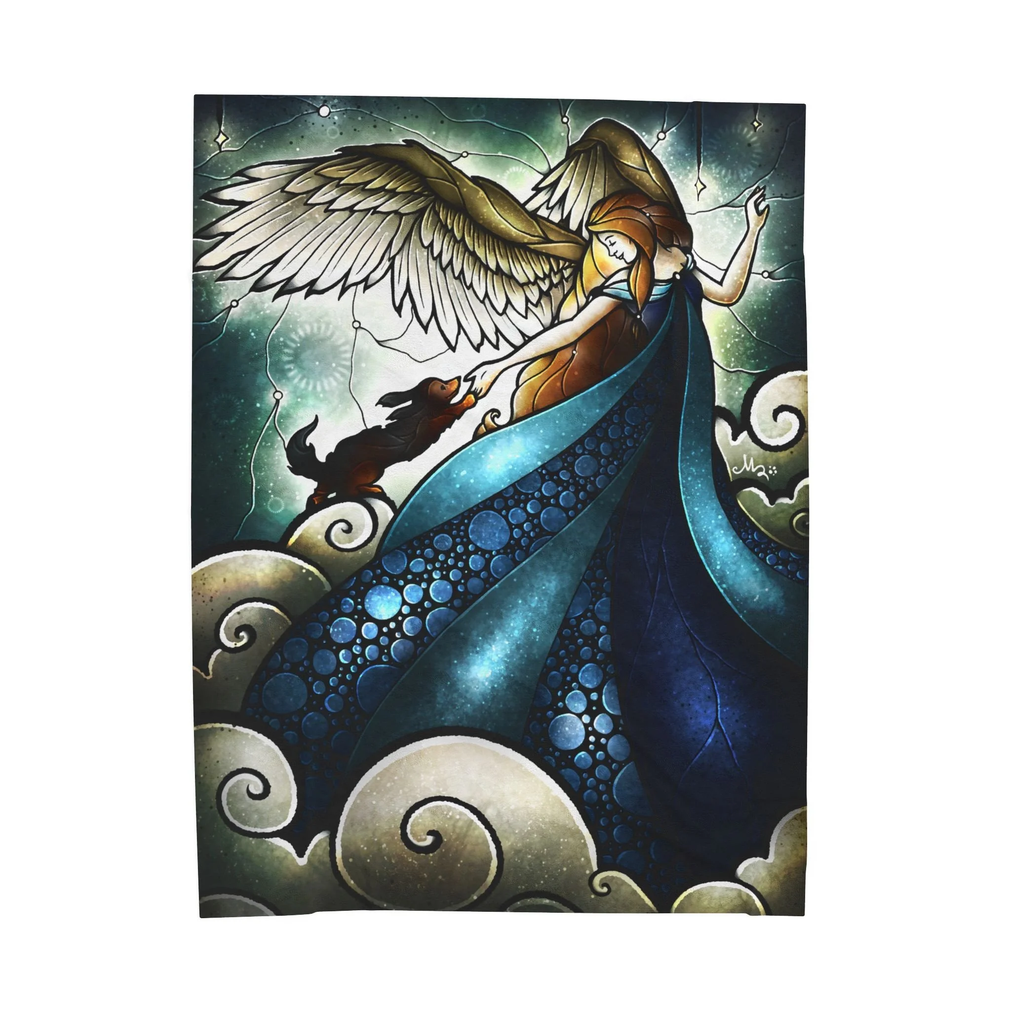 A velveteen plush blanket that feels like a quiet, warm embrace. The artful print shows a guardian angel in flowing blue robes reaching down to welcome a sweet dog into the arms of heaven — a scene that reads like a stained-glass memory. The fabric has a soft, slightly dense hand that drapes well over shoulders or across a couch, and the print side keeps vibrant color and fine detail so the illustration remains luminous. Lightweight enough to carry between rooms, yet substantial enough to settle into on a cool evening. This blanket is a straight up warm hug: perfect for late-night reading, watching storms, or creating a comforting nook for pet loss, memorial rememberance, and comfort spaces. A great reminded as well that something so pure as the love of a pet will return back to the source of love that they came from. :)