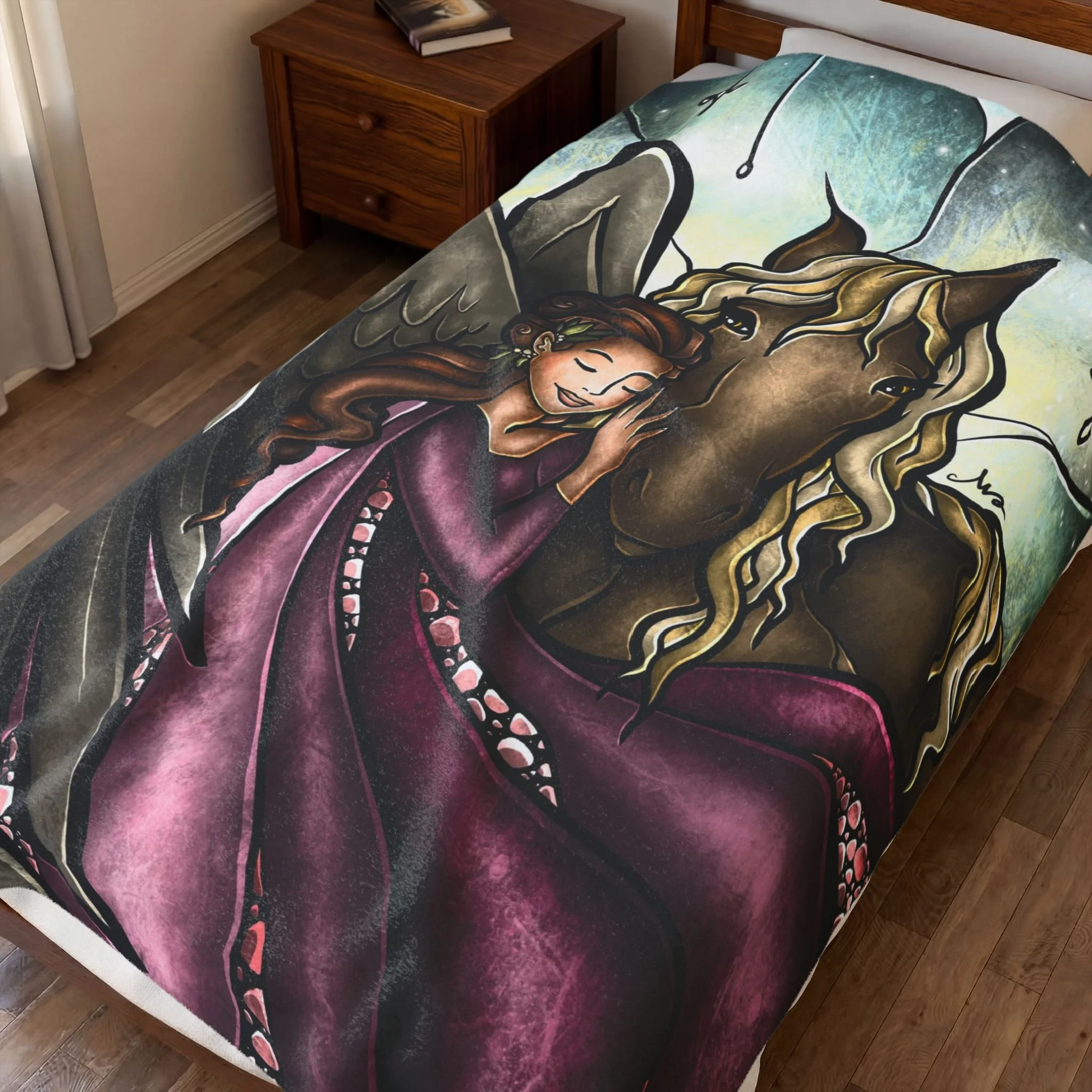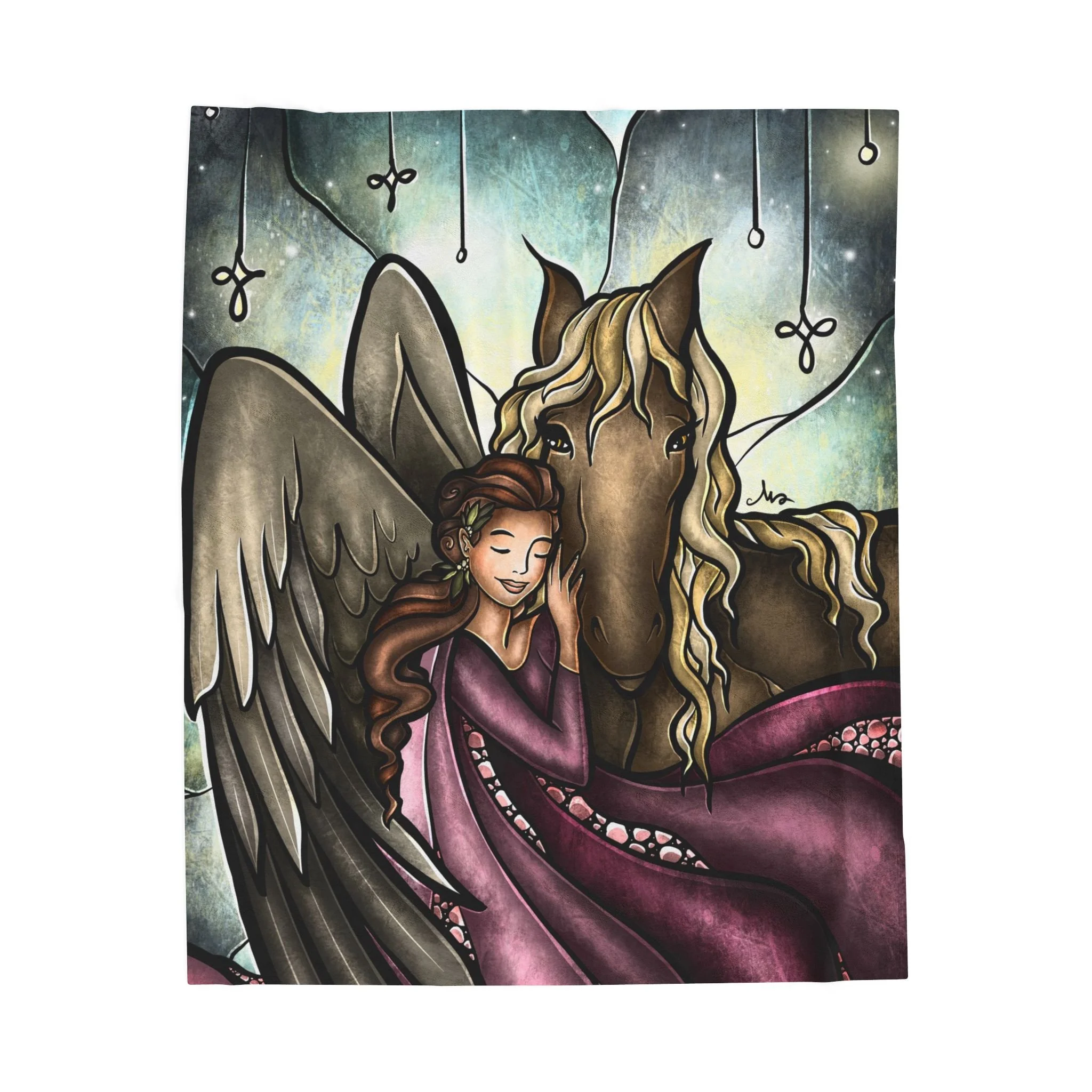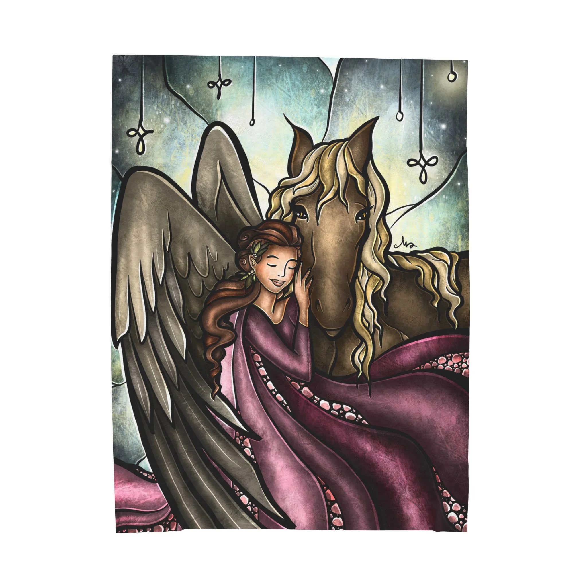 Wrap yourself in a quiet, tender moment with this velvety plush blanket. A gentle angel cradles a horse in an embrace that feels like a soft arriving — warm, safe, and full of reverence. The scene invites slow breaths and memory work: an evening by lamplight, a remembered gallop slowing to a hush, the slow comfort of loss turning into gratitude. This blanket lives where animal lovers keep their stories — draped over a favorite chair, folded at the foot of a bed, or used during a night of remembrance. The plush texture and rich print let the artwork hold its warmth and detail, so the image of that welcoming hug stays vivid as you wrap up. Thoughtful stitching and a substantial, soft hand make it built for the repeated rituals of comfort and reflection that follow the hardest goodbyes.