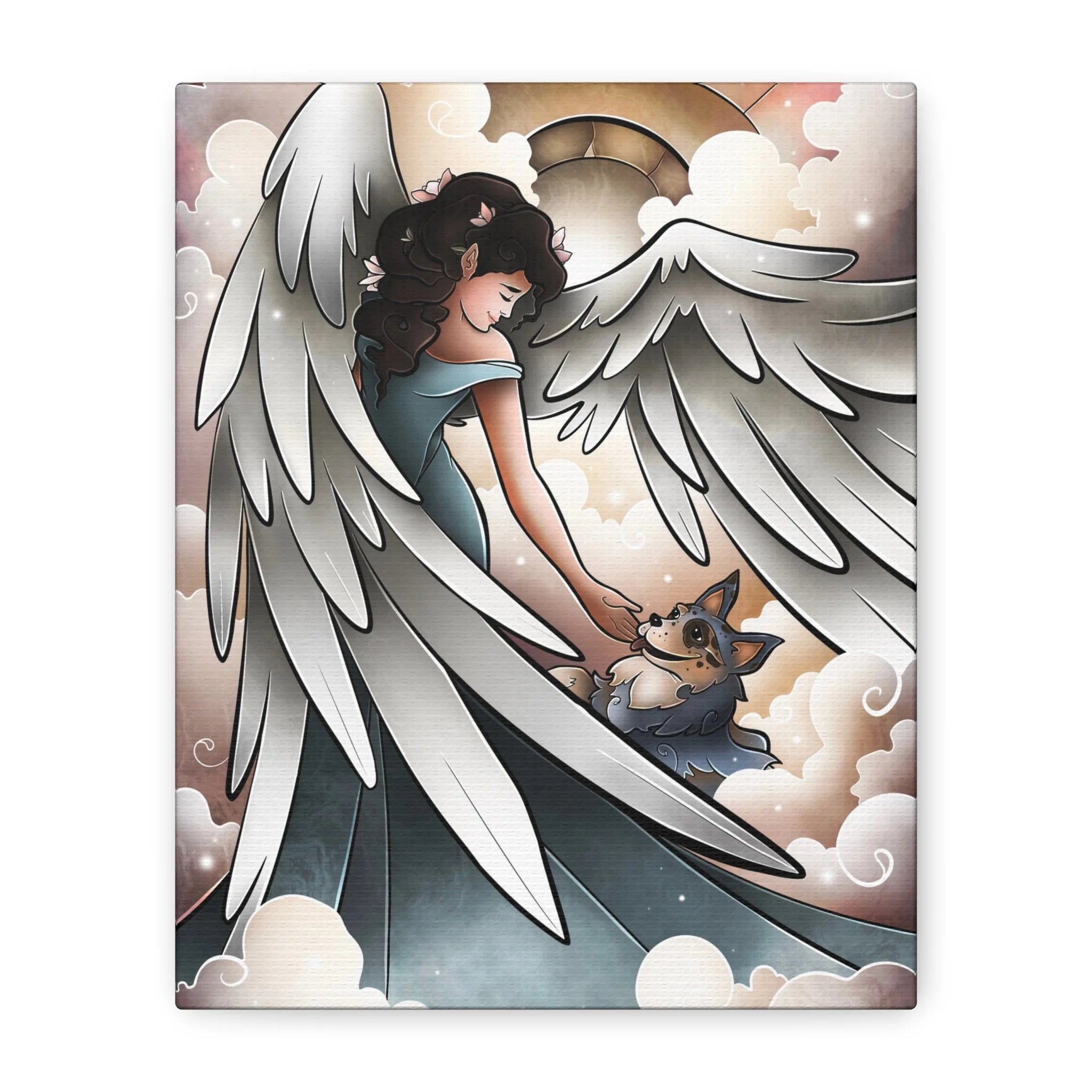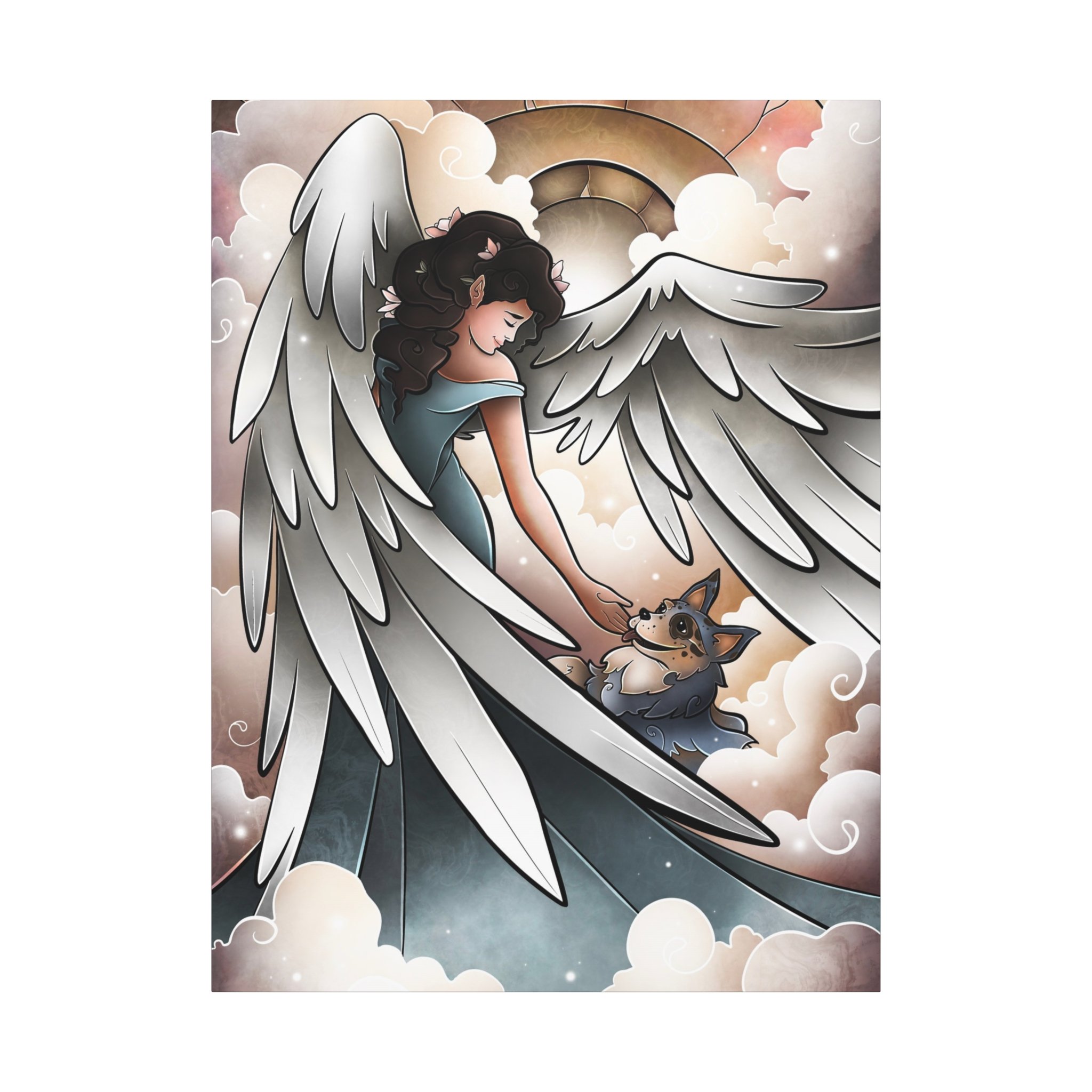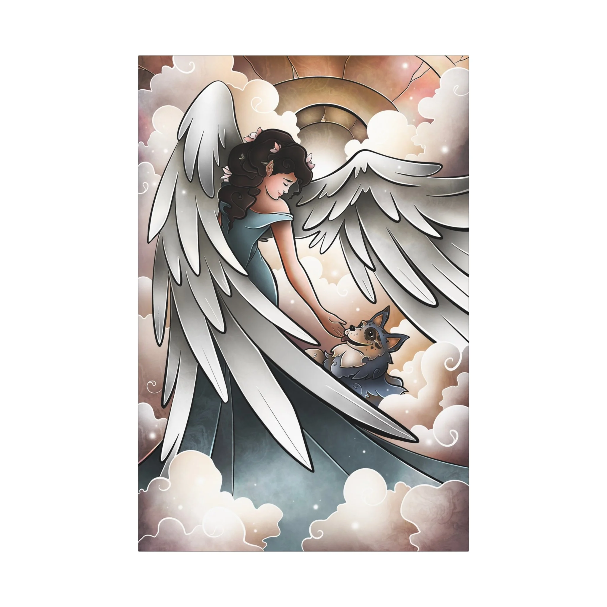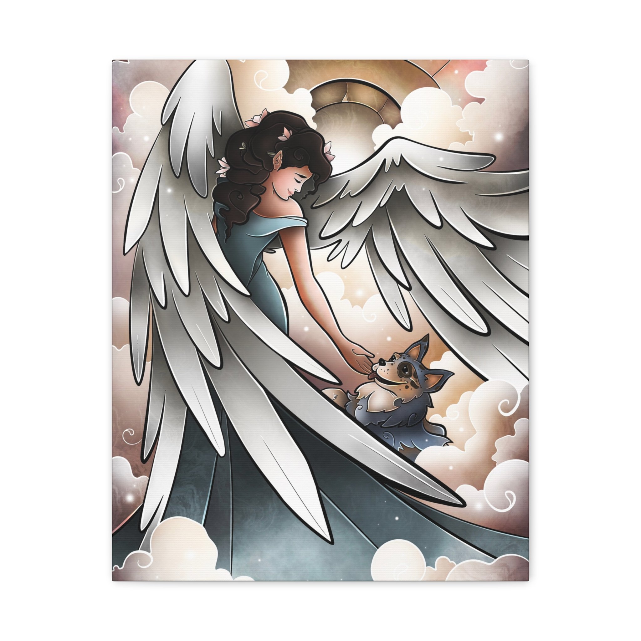 A serene and comforting canvas print featuring a beautiful angel welcoming a blue heeler into heaven and going for a lovely walk. Perfect for those looking for a peaceful and calming addition to their home decor. Ideal for pet lovers or those looking for a spiritual touch in their living space. Great for gifts on occasions such as pet loss, sympathy, or spiritual appreciation.