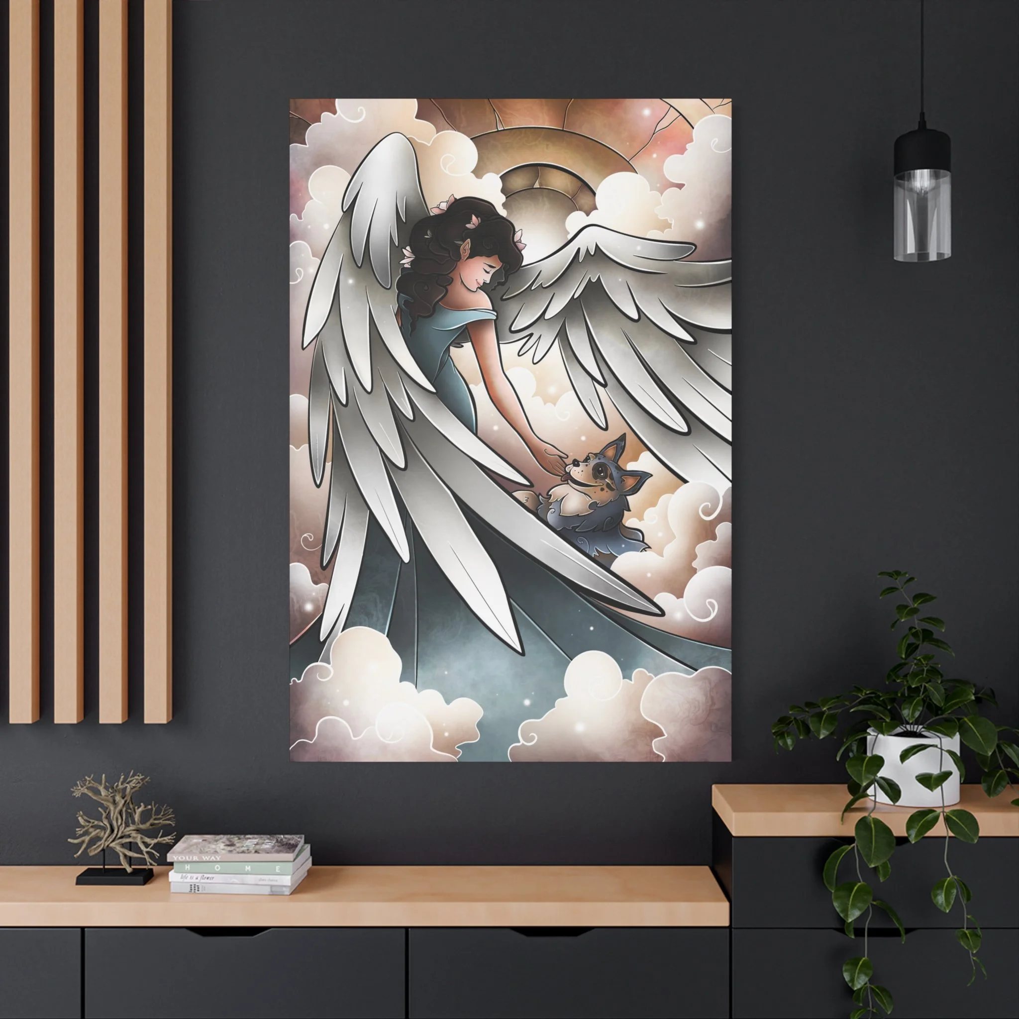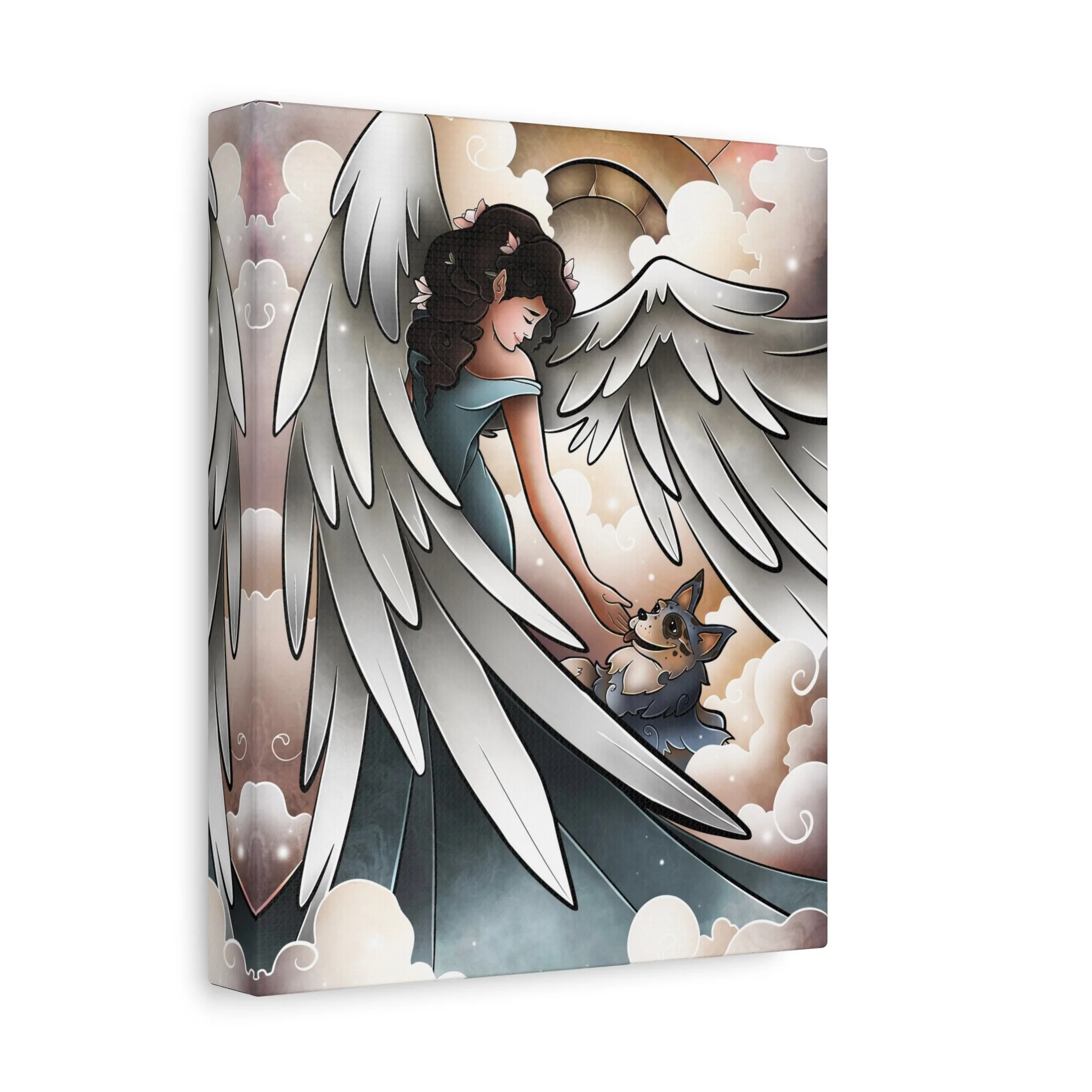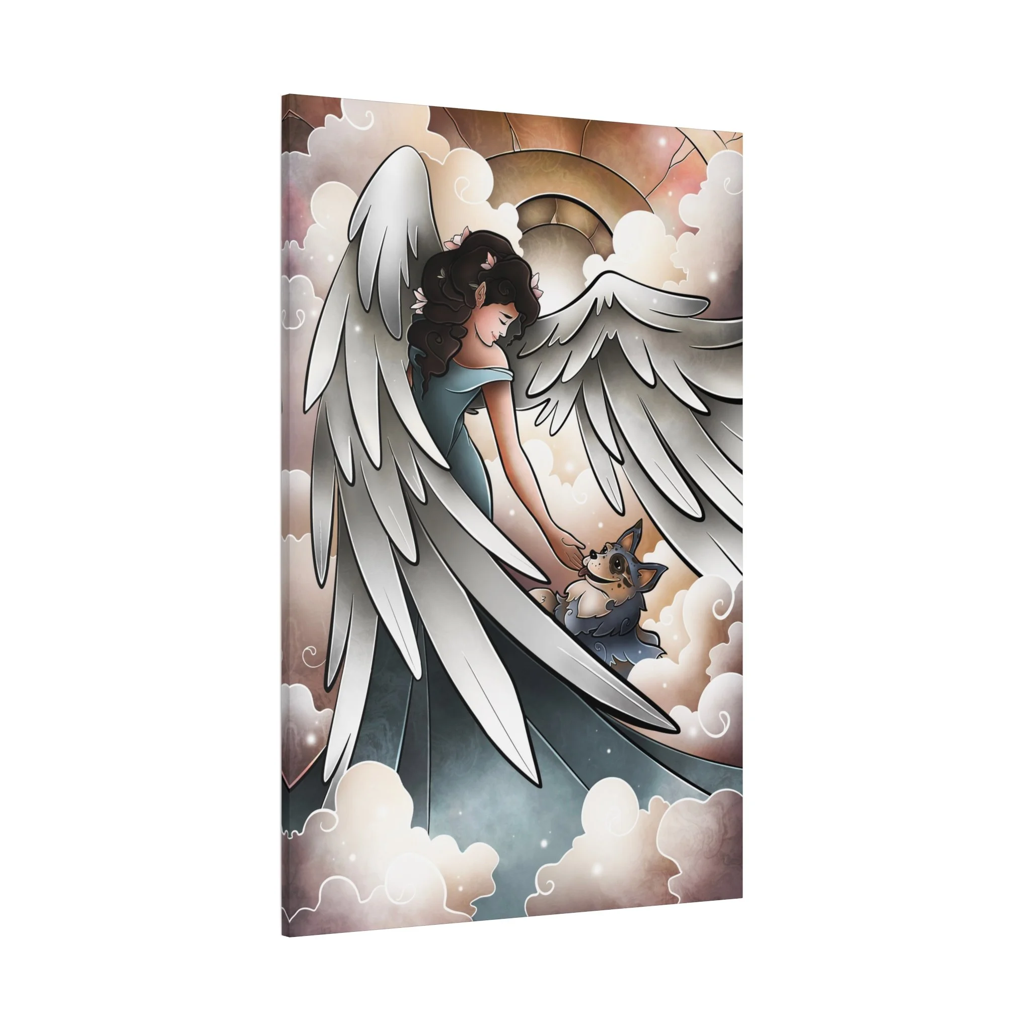 A serene and comforting canvas print featuring a beautiful angel welcoming a blue heeler into heaven and going for a lovely walk. Perfect for those looking for a peaceful and calming addition to their home decor. Ideal for pet lovers or those looking for a spiritual touch in their living space. Great for gifts on occasions such as pet loss, sympathy, or spiritual appreciation.