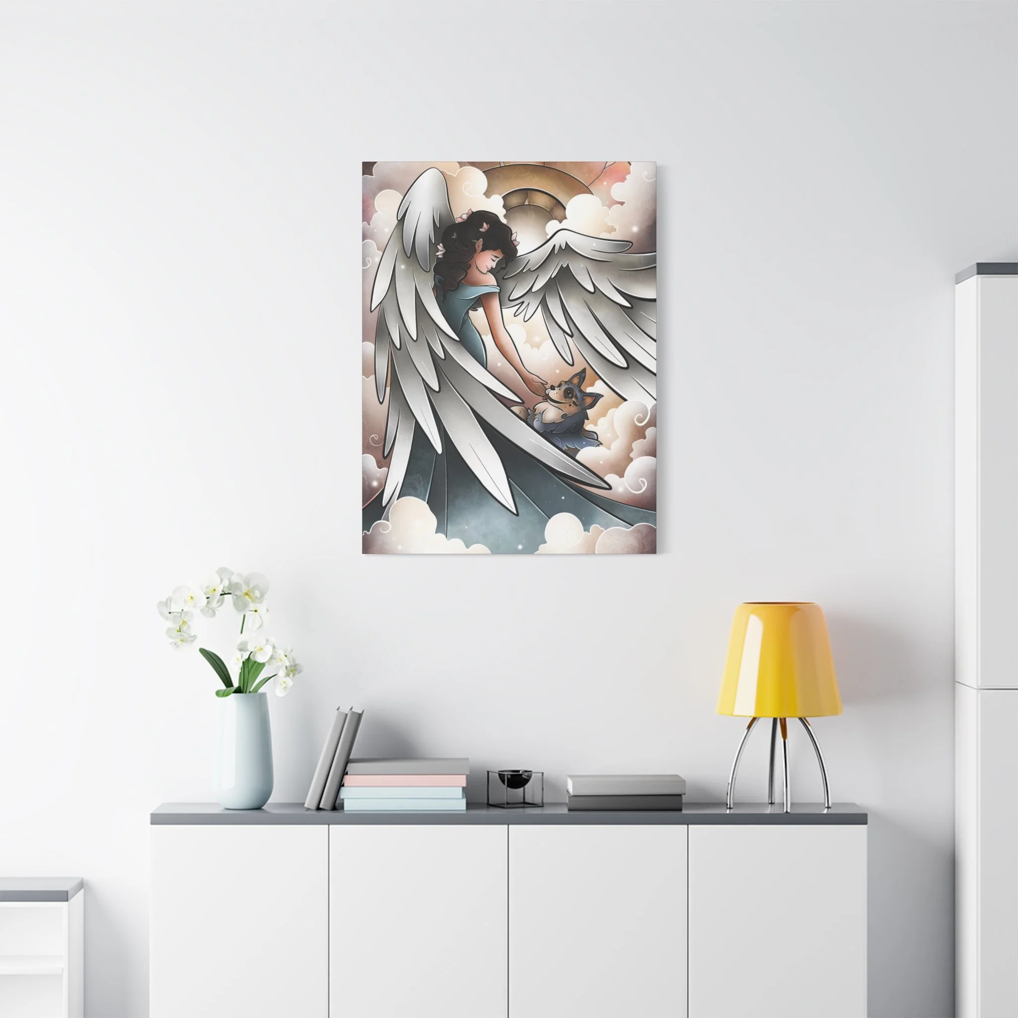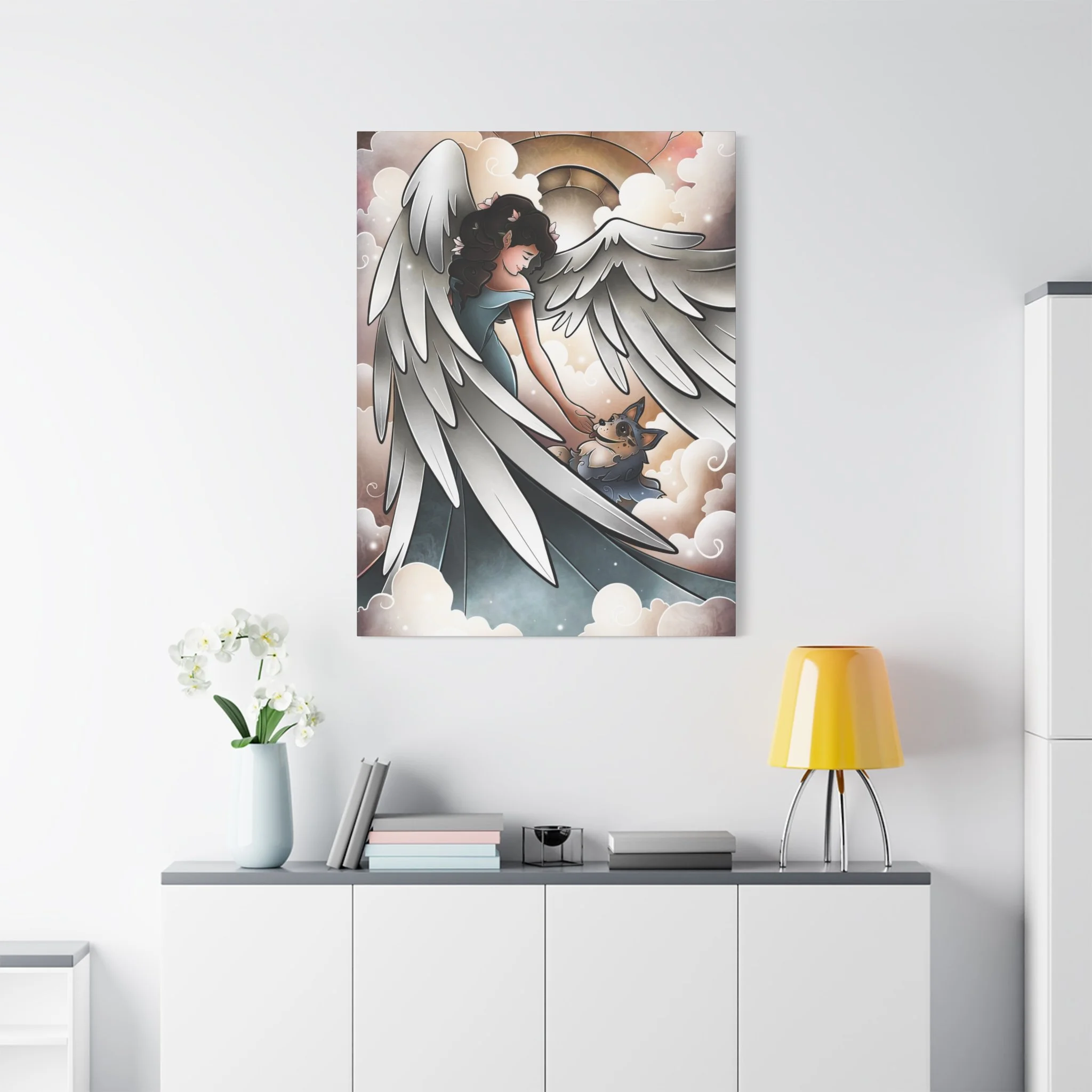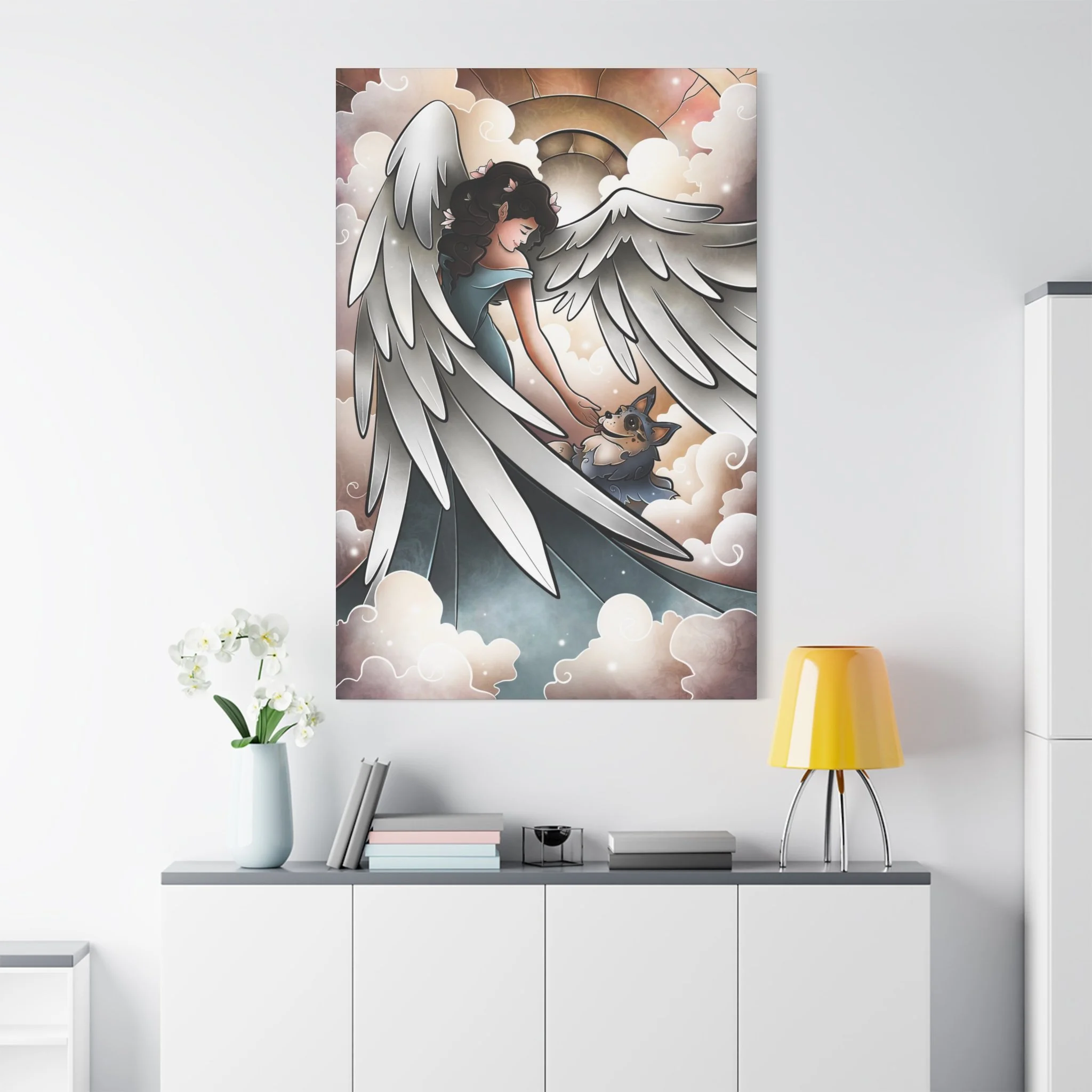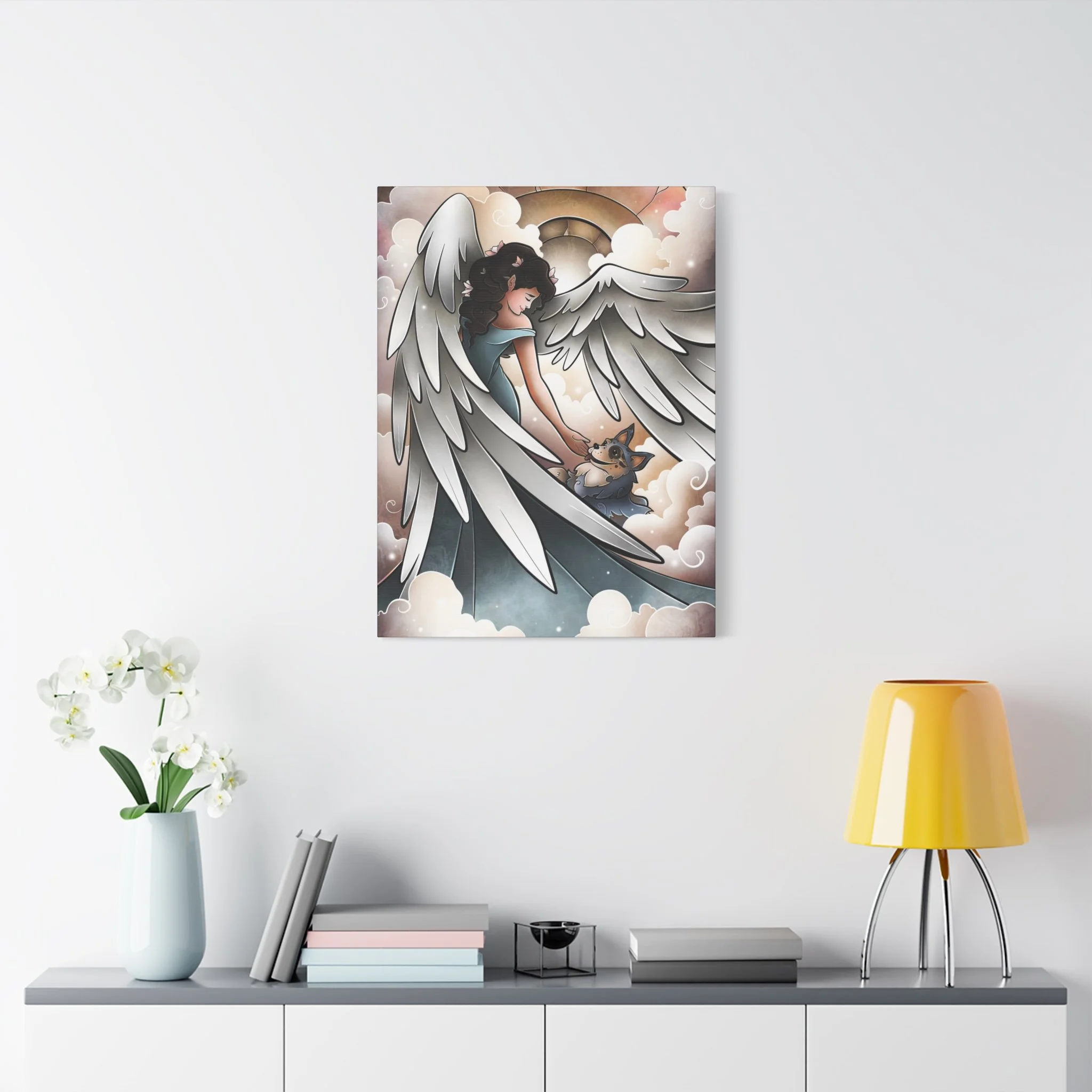 A serene and comforting canvas print featuring a beautiful angel welcoming a blue heeler into heaven and going for a lovely walk. Perfect for those looking for a peaceful and calming addition to their home decor. Ideal for pet lovers or those looking for a spiritual touch in their living space. Great for gifts on occasions such as pet loss, sympathy, or spiritual appreciation.