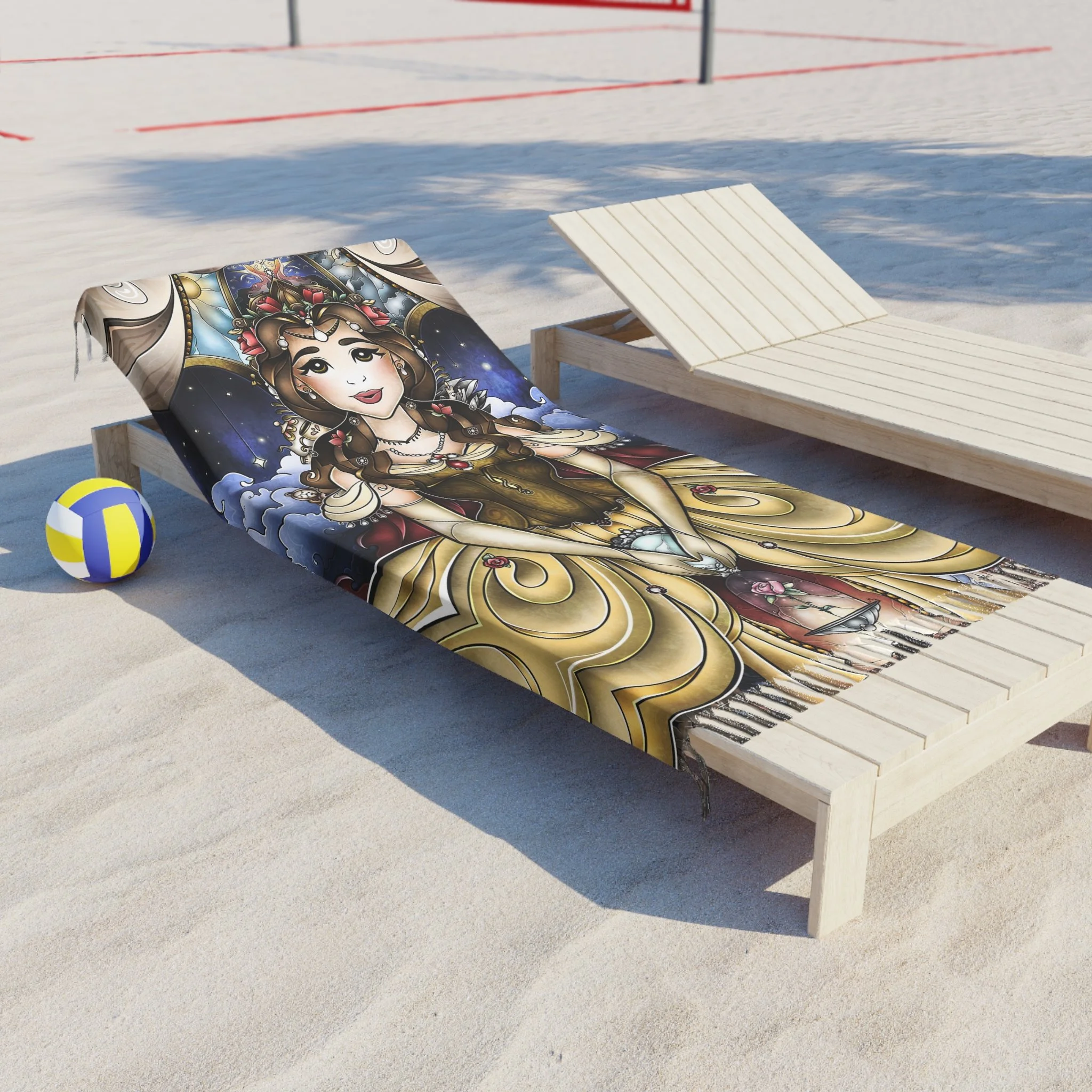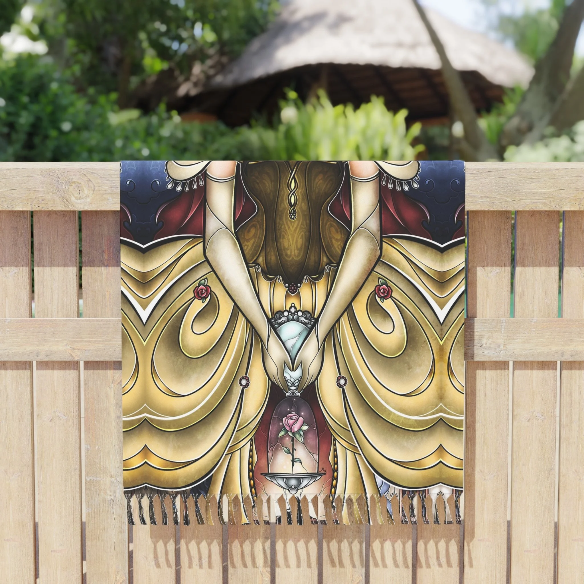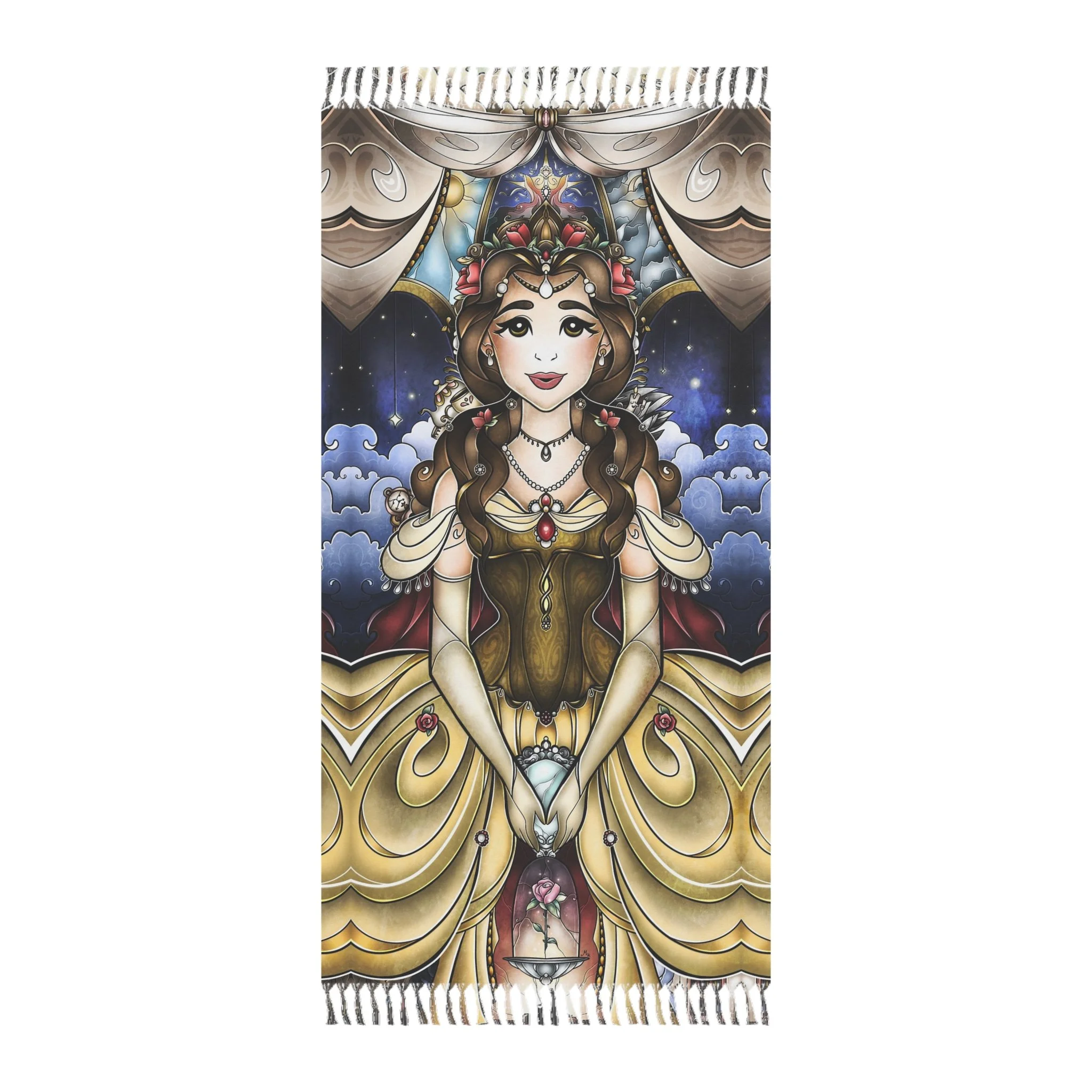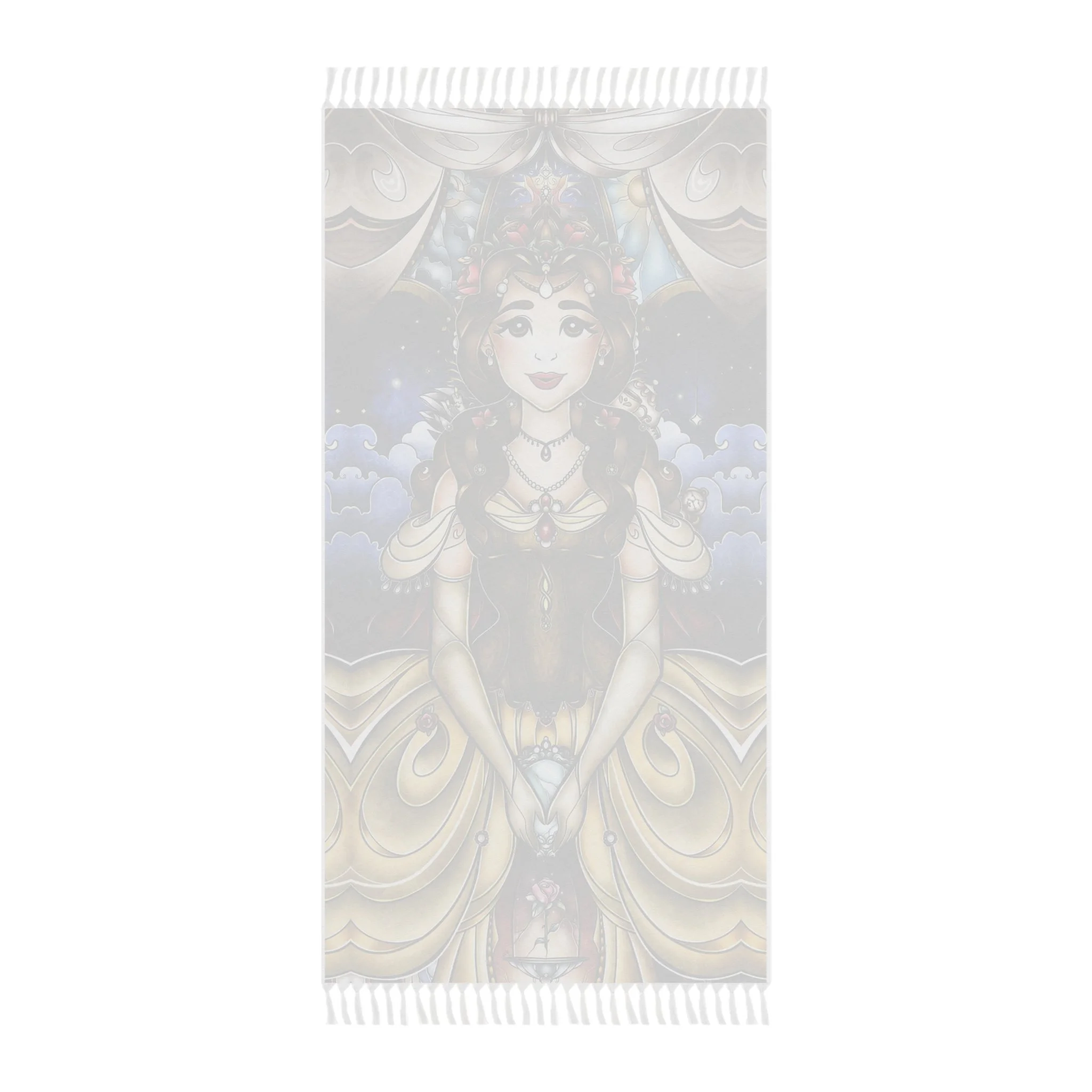 This lightweight, artful cloth brings bohemian color and story to every home, shoreline, campfire and travel moment. Printed in vivid, jewel-toned inks, the design shows the Beauty in a magical light framed by ornate, stained-glass shapes — a piece that reads like a portable tapestry. Use it as a sandy spread, quick-dry wrap, or a decorative throw when you want your space to feel curated and warm. The polyester fabric dries fast and keeps its shape while the knotted tassels add a handmade, wanderer’s touch. Carry it folded in your bag for weekend escapes, drape it over an arm chair, or lay it under the sun and watch the colors deepen as you disappear into a good book.