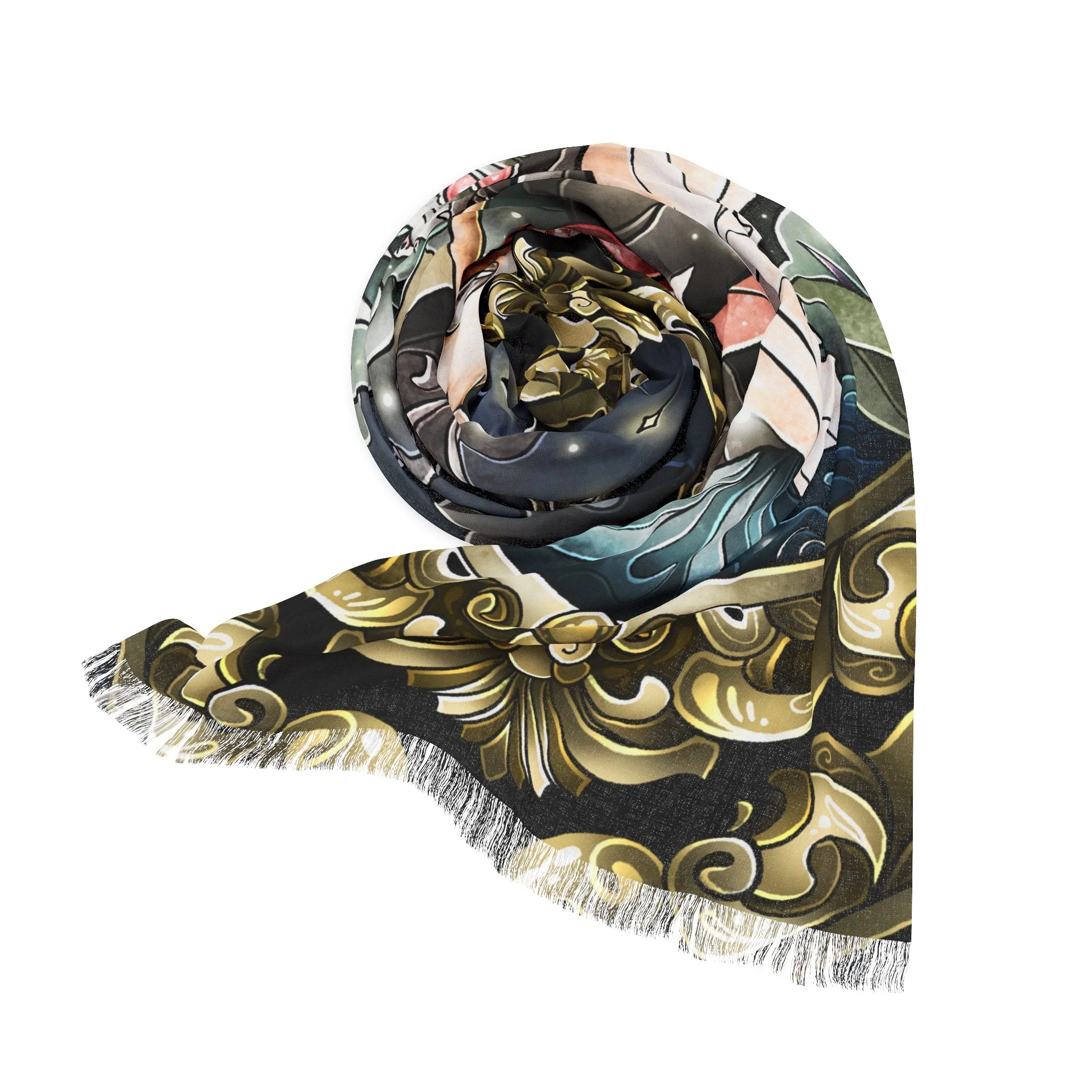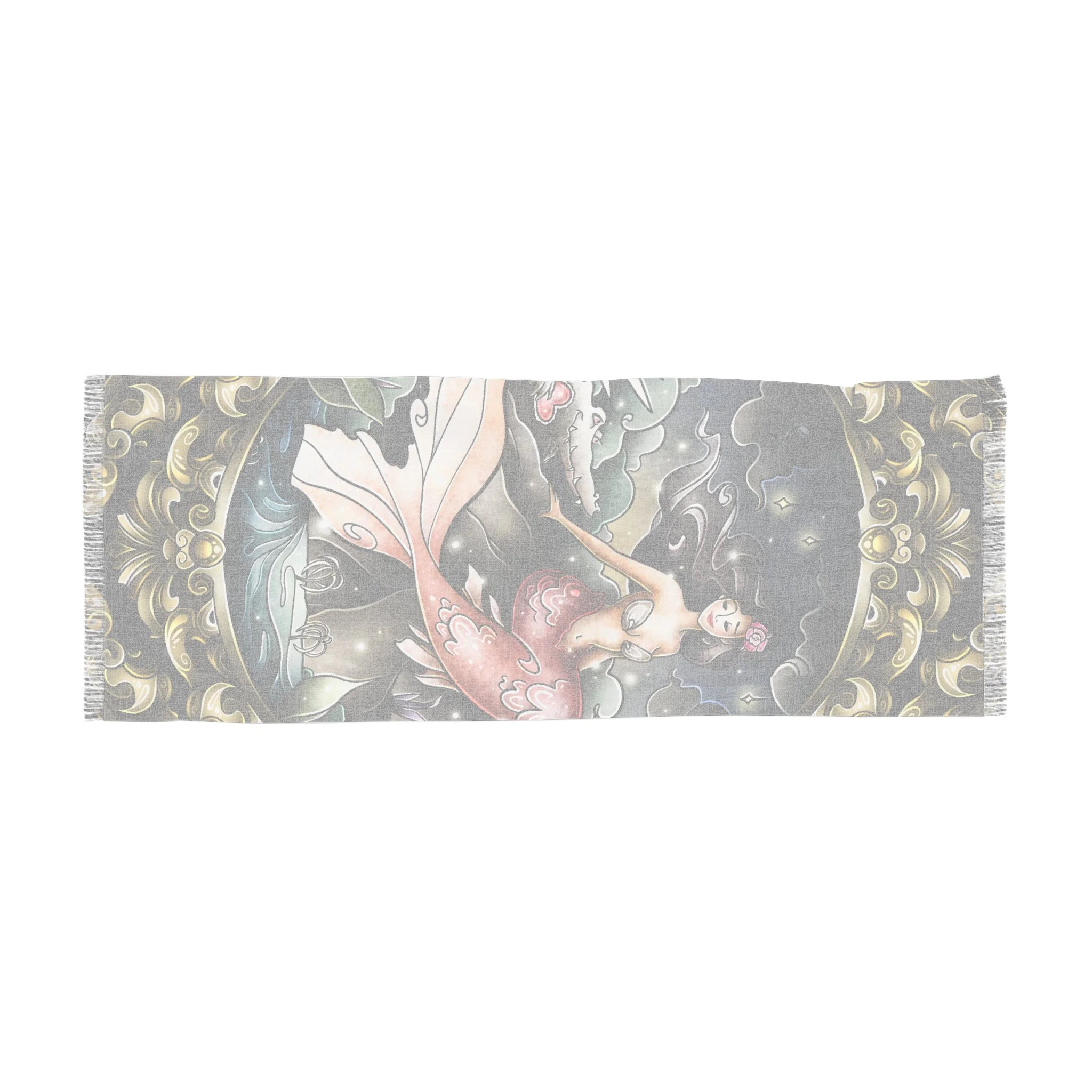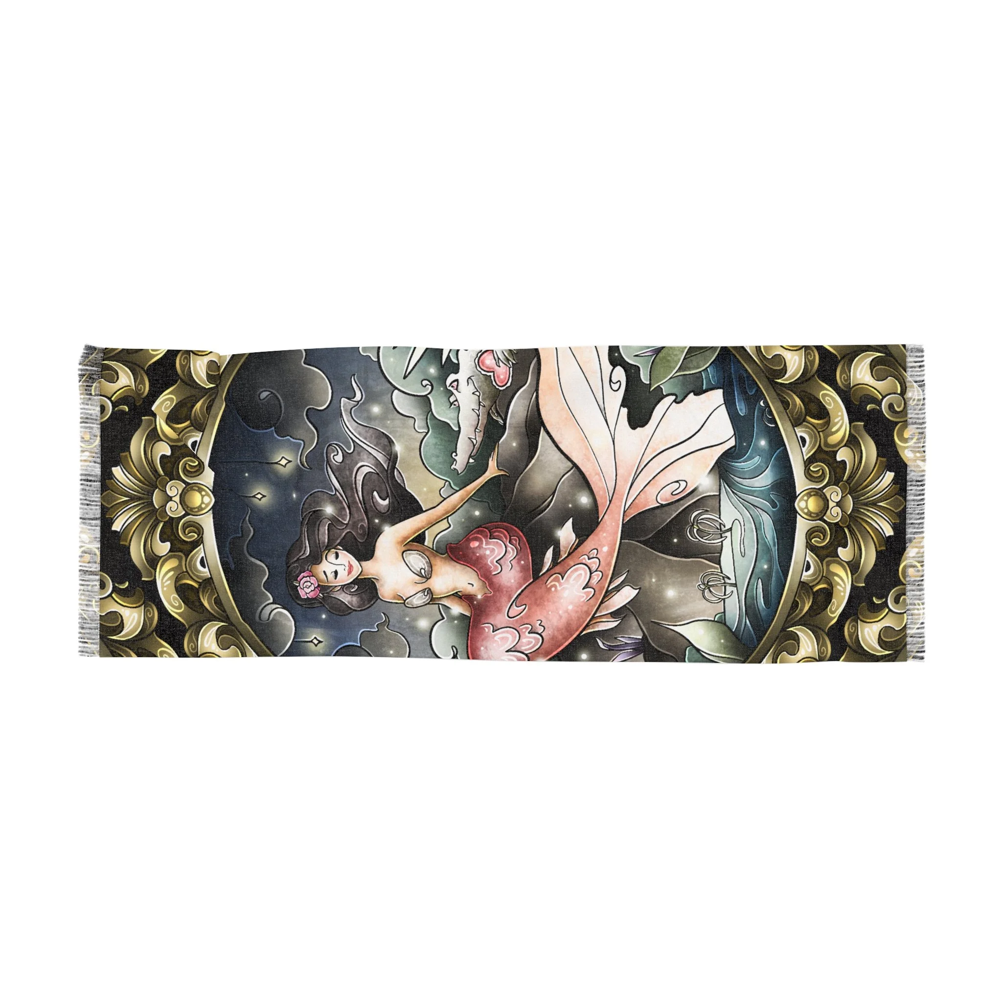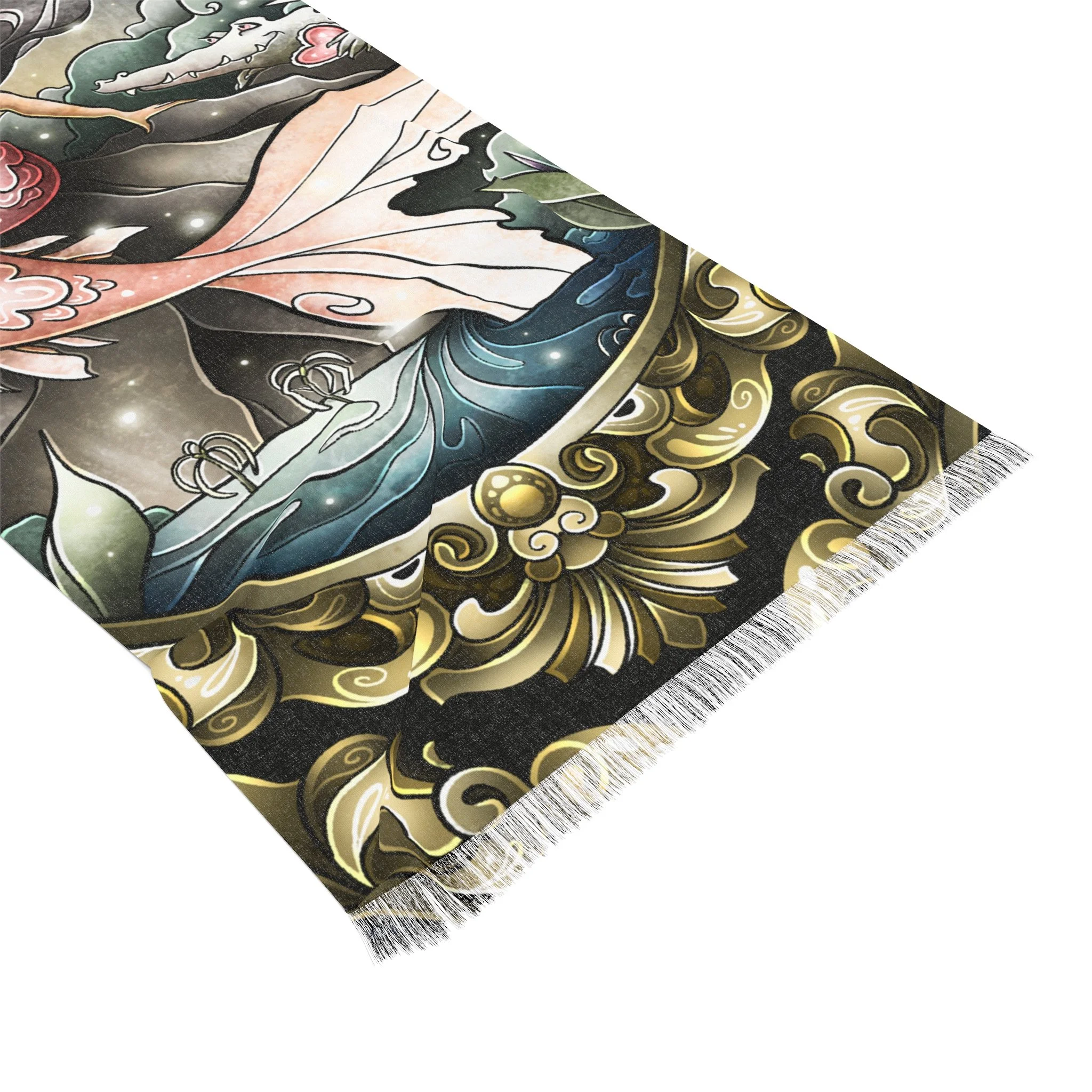 Wrap yourself in a playful slice of bayou romance. A Louisiana gator shyly offers chocolates to his favorite mermaid — a small moment of mischief and sweetness rendered in bright, saturated inks across a lightweight scarf. The semi-translucent print lets colors glow through softly, so the scene feels like a secret glimpse when the fabric moves. Wear it draped over a coat or tied at the neck on cooler evenings at a riverside market, or let it flutter from a bag to add a touch of southern folk charm to everyday outfits. This scarf speaks to people who love quirky, narrative accessories and who enjoy telling stories with what they wear, especially around cozy, sentimental gatherings like Valentine’s nights and low-key date strolls by the Bayou.