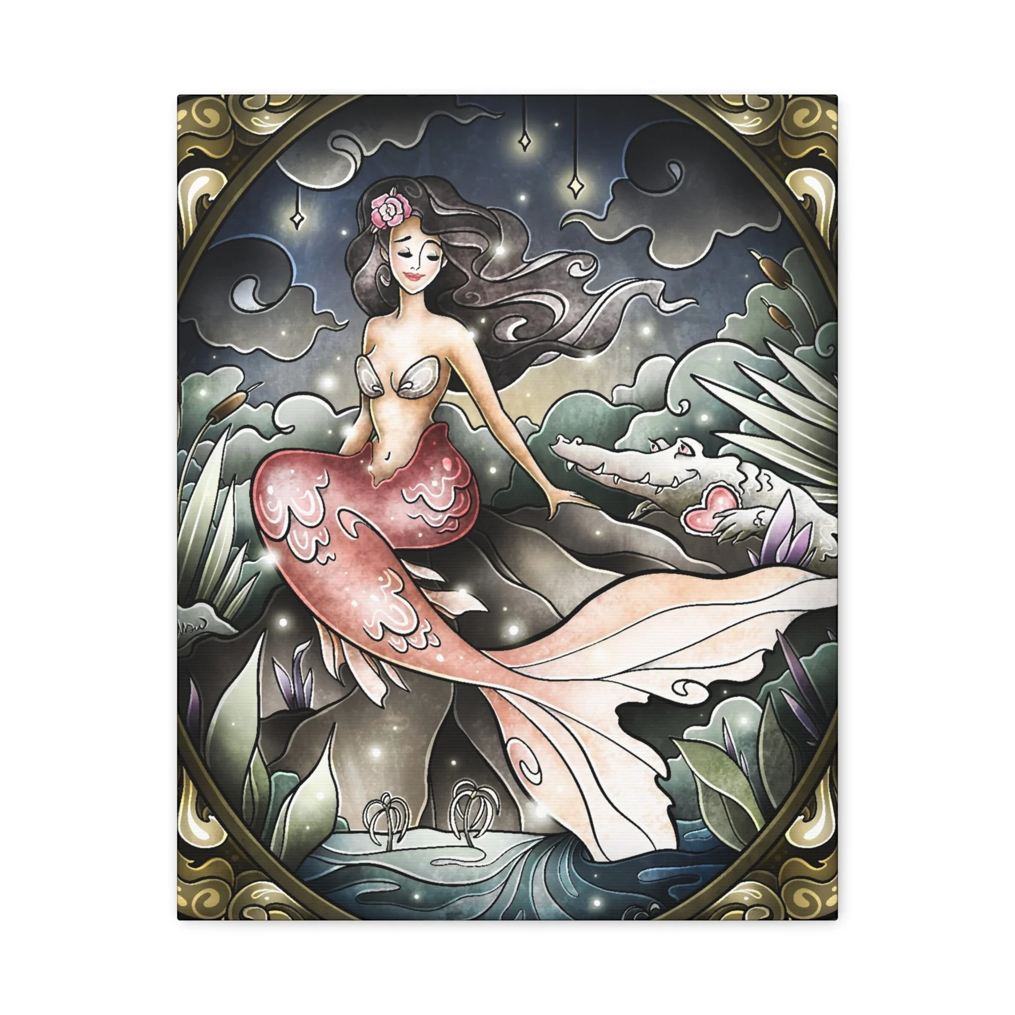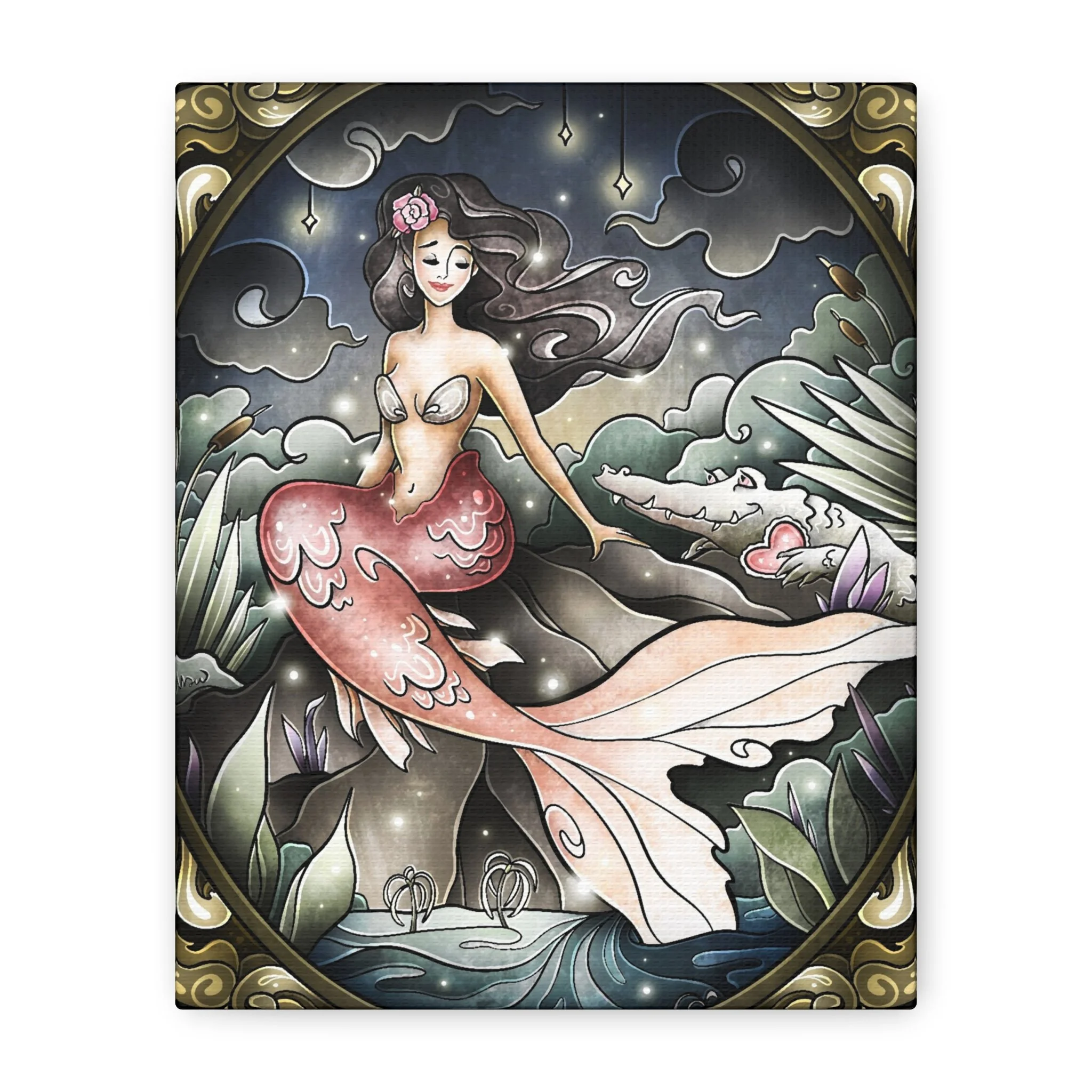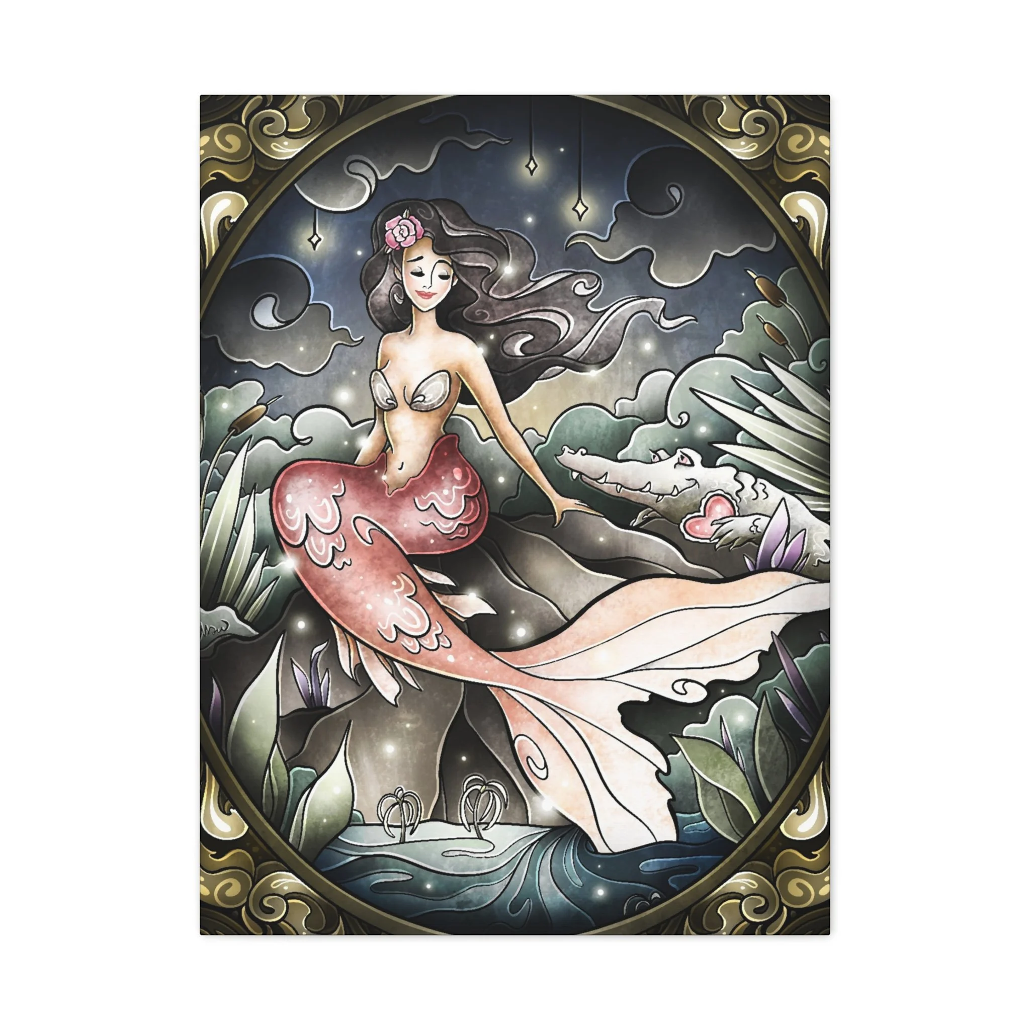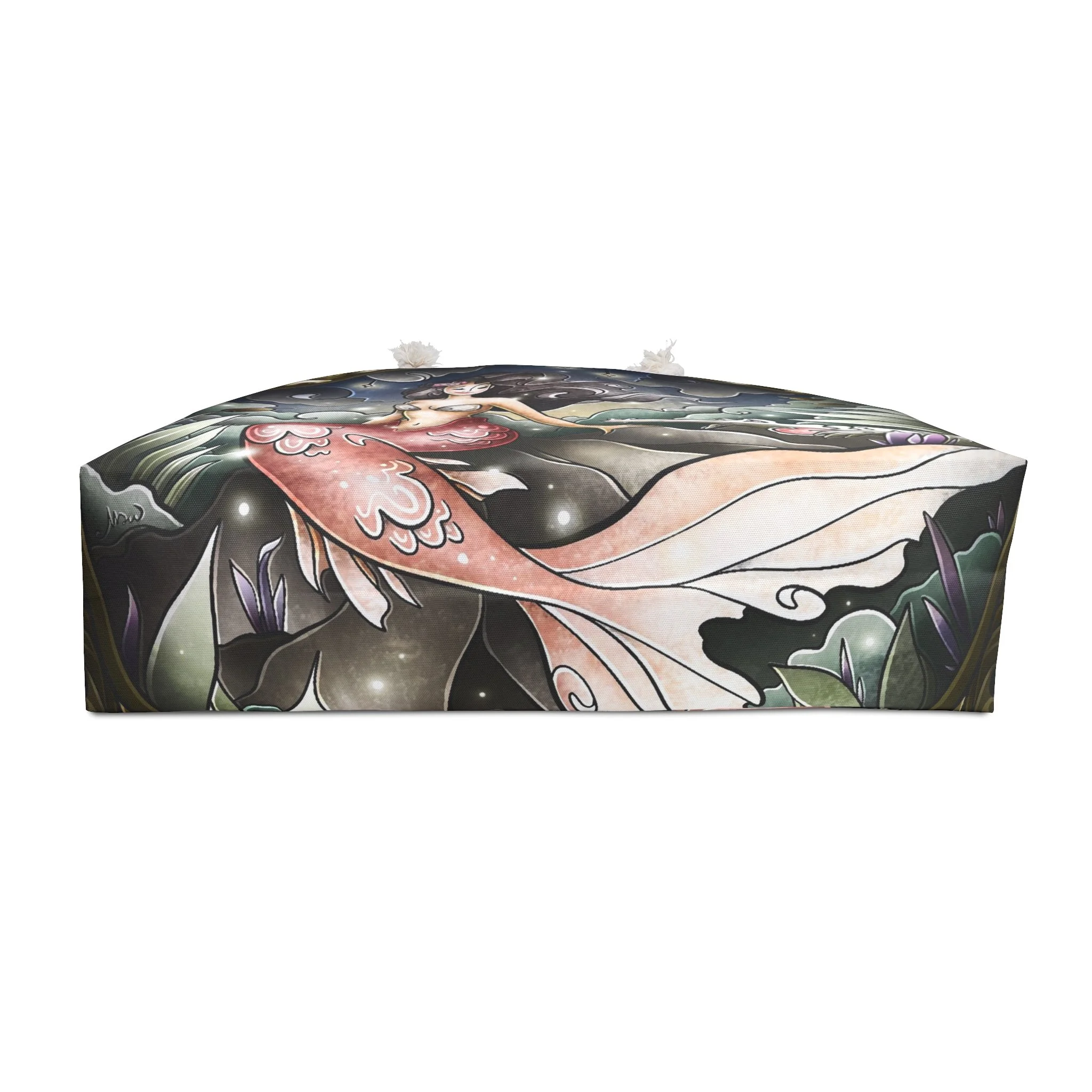 This roomy weekender bag carries a curious little story painted on: Louisiana's famous albino alligator, pale as salt air, but heart as pink as a rose, offering a box of chocolates to his favorite bayou mermaid. The painted scene feels like a twilight visit on a slow swamp—moss-hung cypress, lantern glow, and a quiet, playful exchange that turns a travel bag into something personal and memorable. The soft cream rope handles and warm cream lining keep the palette gentle and coastal, while the sturdy spun polyester exterior resists wrinkles and holds the artwork crisp through trips and errands. Bring this bag to weekend markets, ferry rides, or a cozy overnight at a bayou bed and breakfast; it sits easily on your shoulder and opens wide for layers, books, and a change of shoes. The story on the fabric invites conversations and quietly announces a love of Southern folklore and whimsical cajun charm.