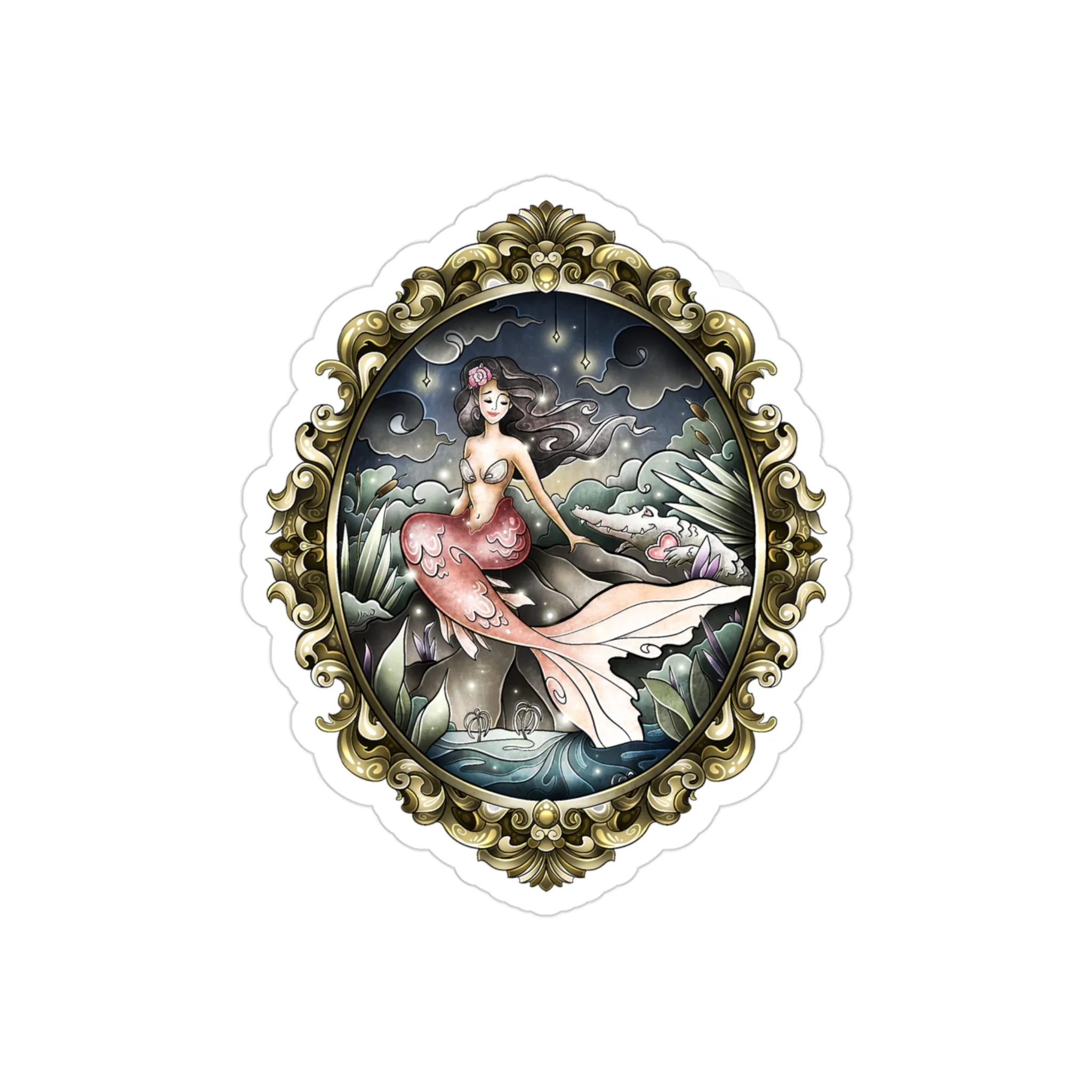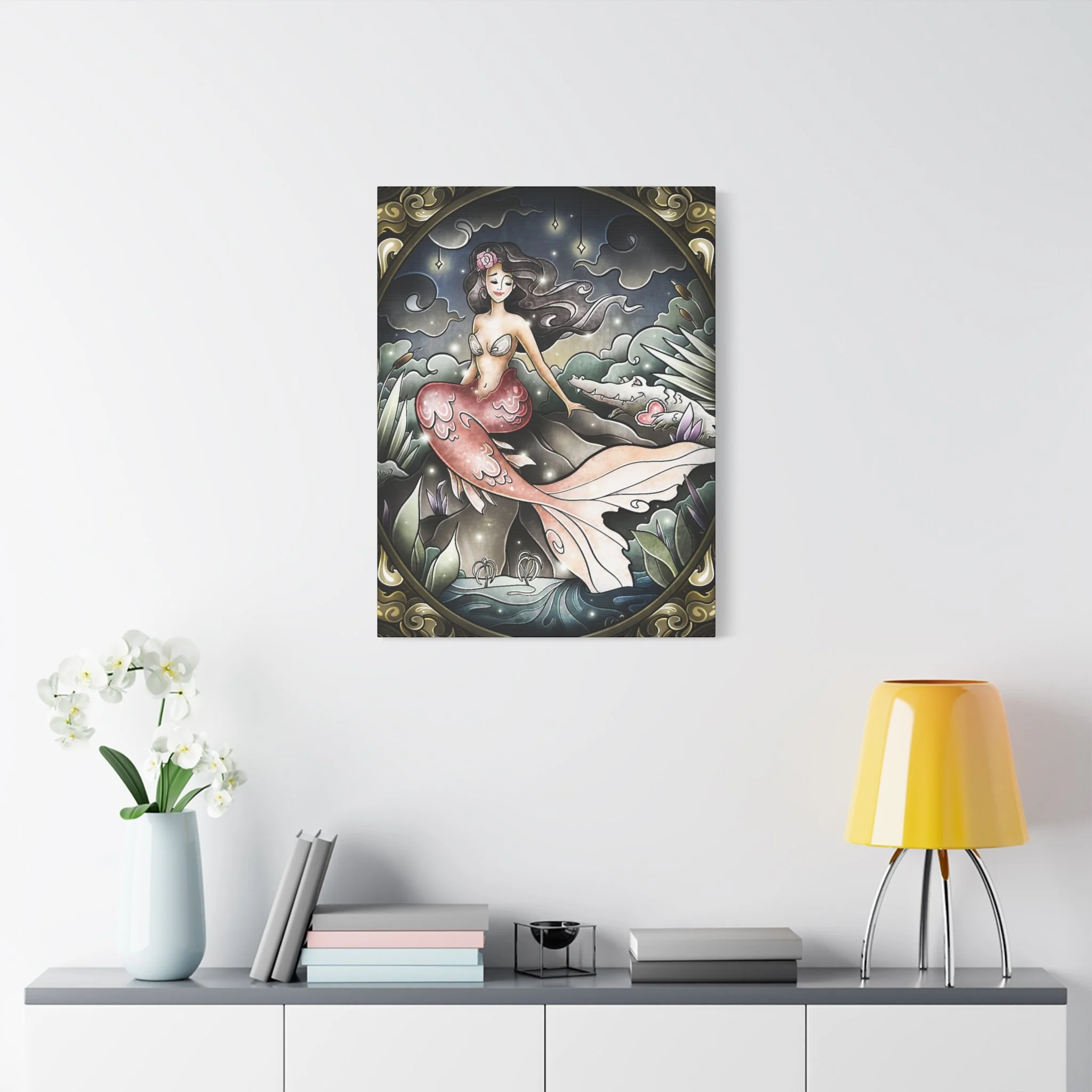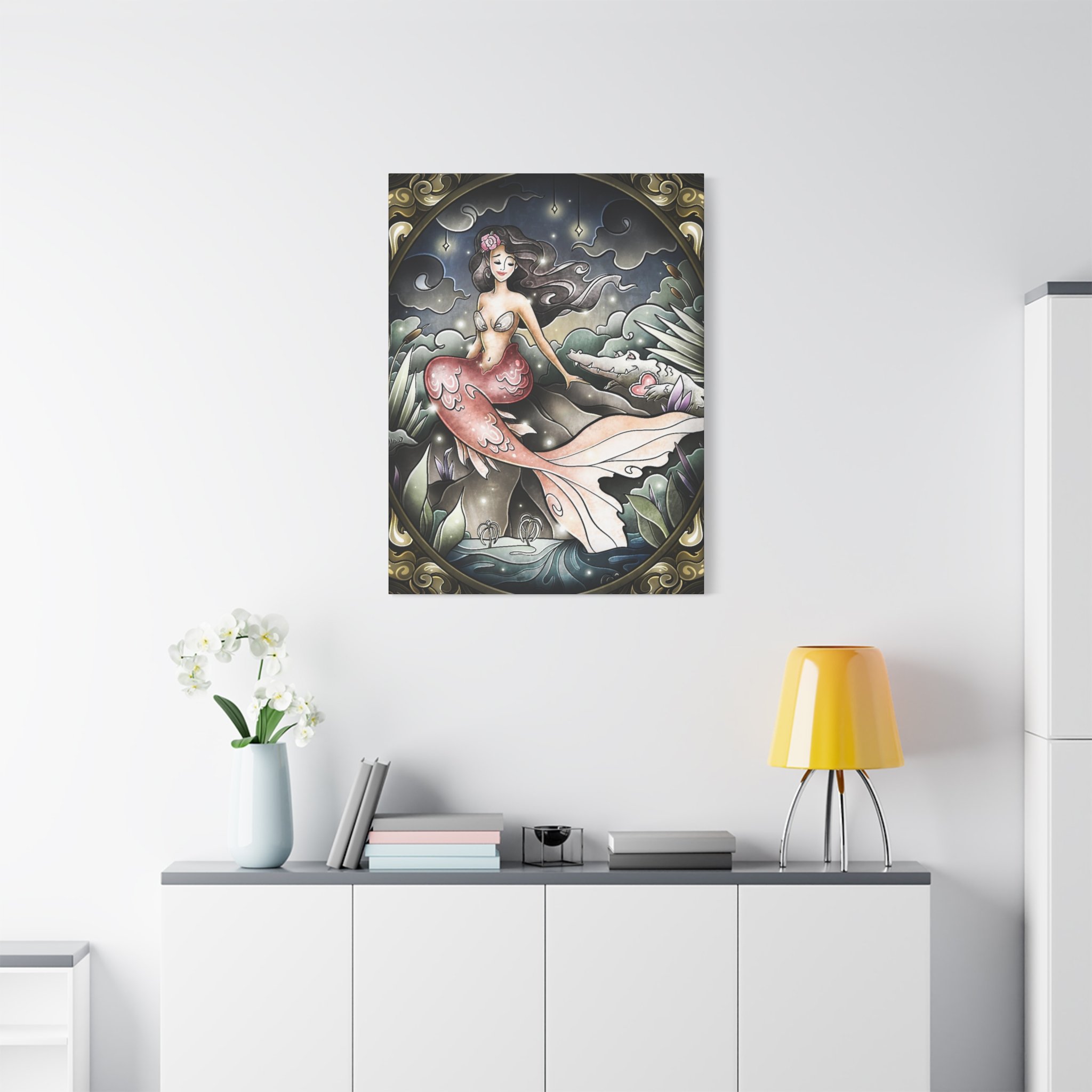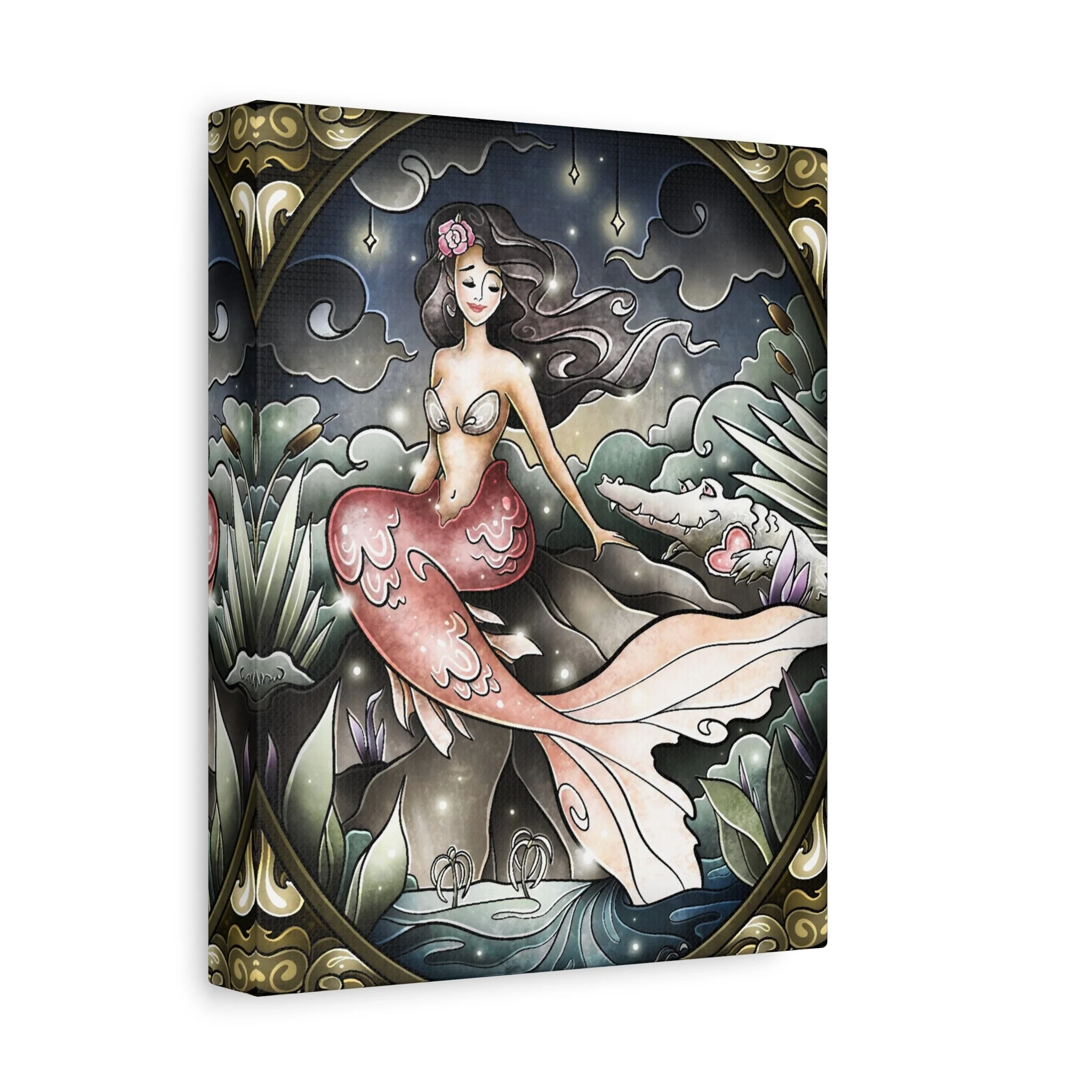 This roomy weekender bag carries a curious little story painted on: Louisiana's famous albino alligator, pale as salt air, but heart as pink as a rose, offering a box of chocolates to his favorite bayou mermaid. The painted scene feels like a twilight visit on a slow swamp—moss-hung cypress, lantern glow, and a quiet, playful exchange that turns a travel bag into something personal and memorable. The soft cream rope handles and warm cream lining keep the palette gentle and coastal, while the sturdy spun polyester exterior resists wrinkles and holds the artwork crisp through trips and errands. Bring this bag to weekend markets, ferry rides, or a cozy overnight at a bayou bed and breakfast; it sits easily on your shoulder and opens wide for layers, books, and a change of shoes. The story on the fabric invites conversations and quietly announces a love of Southern folklore and whimsical cajun charm.