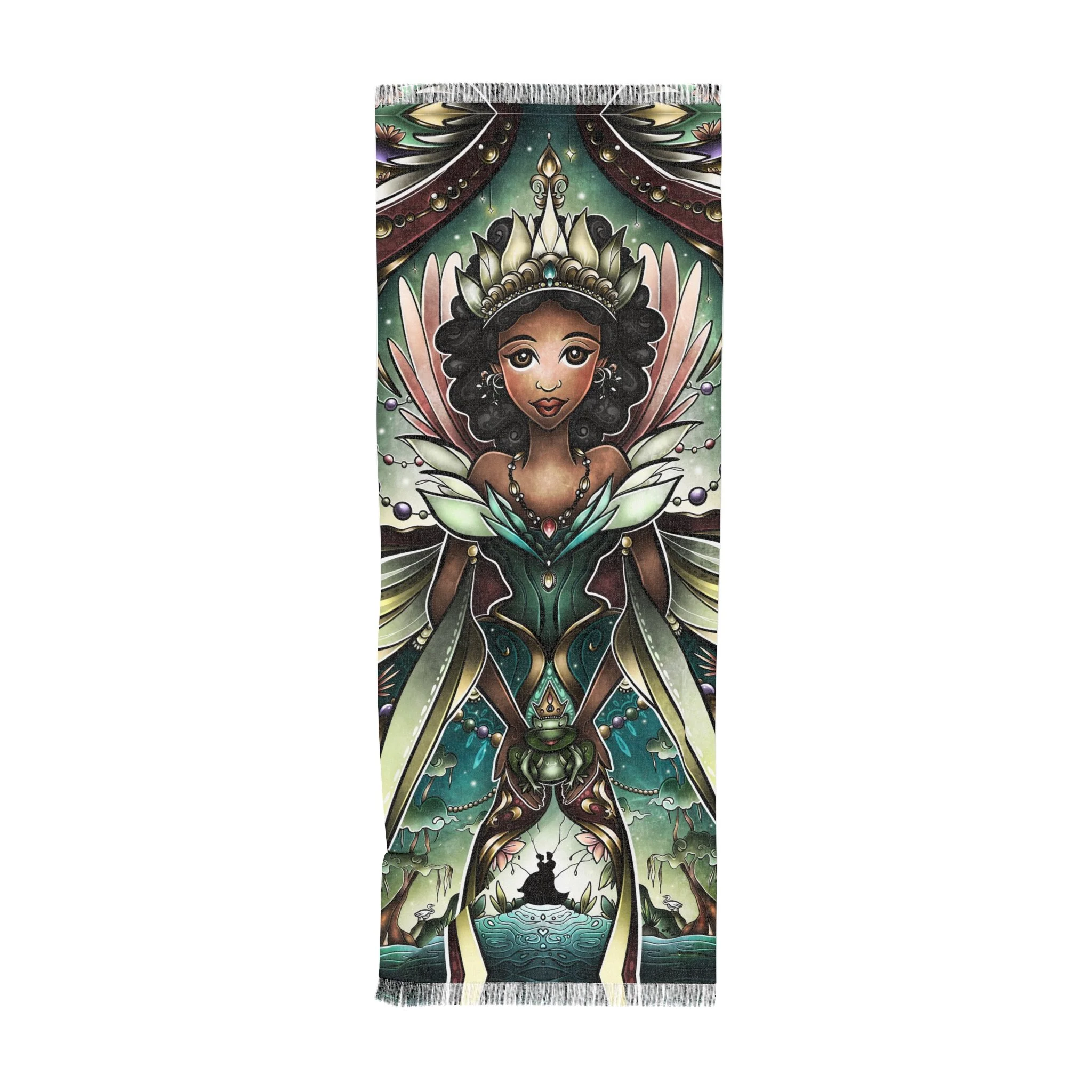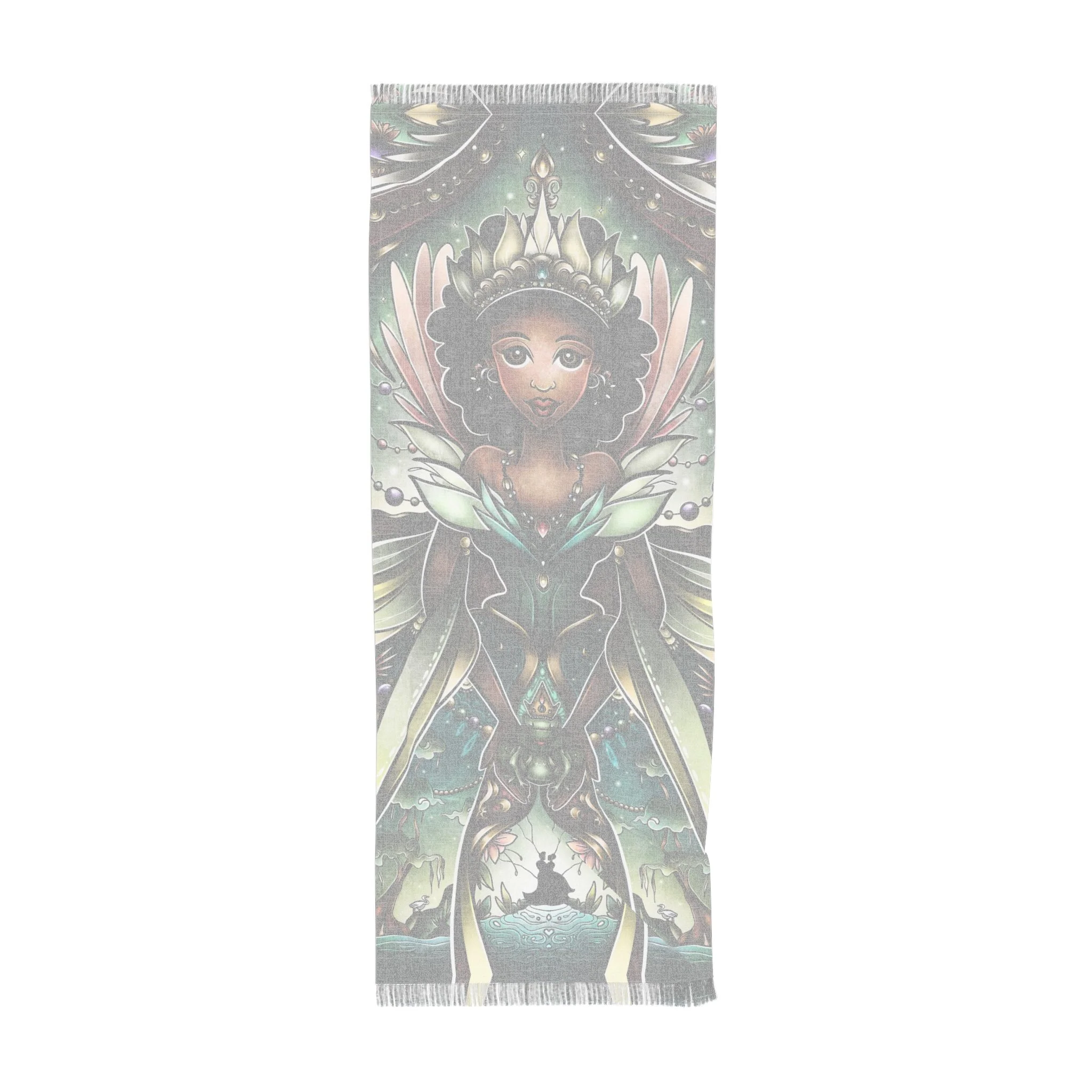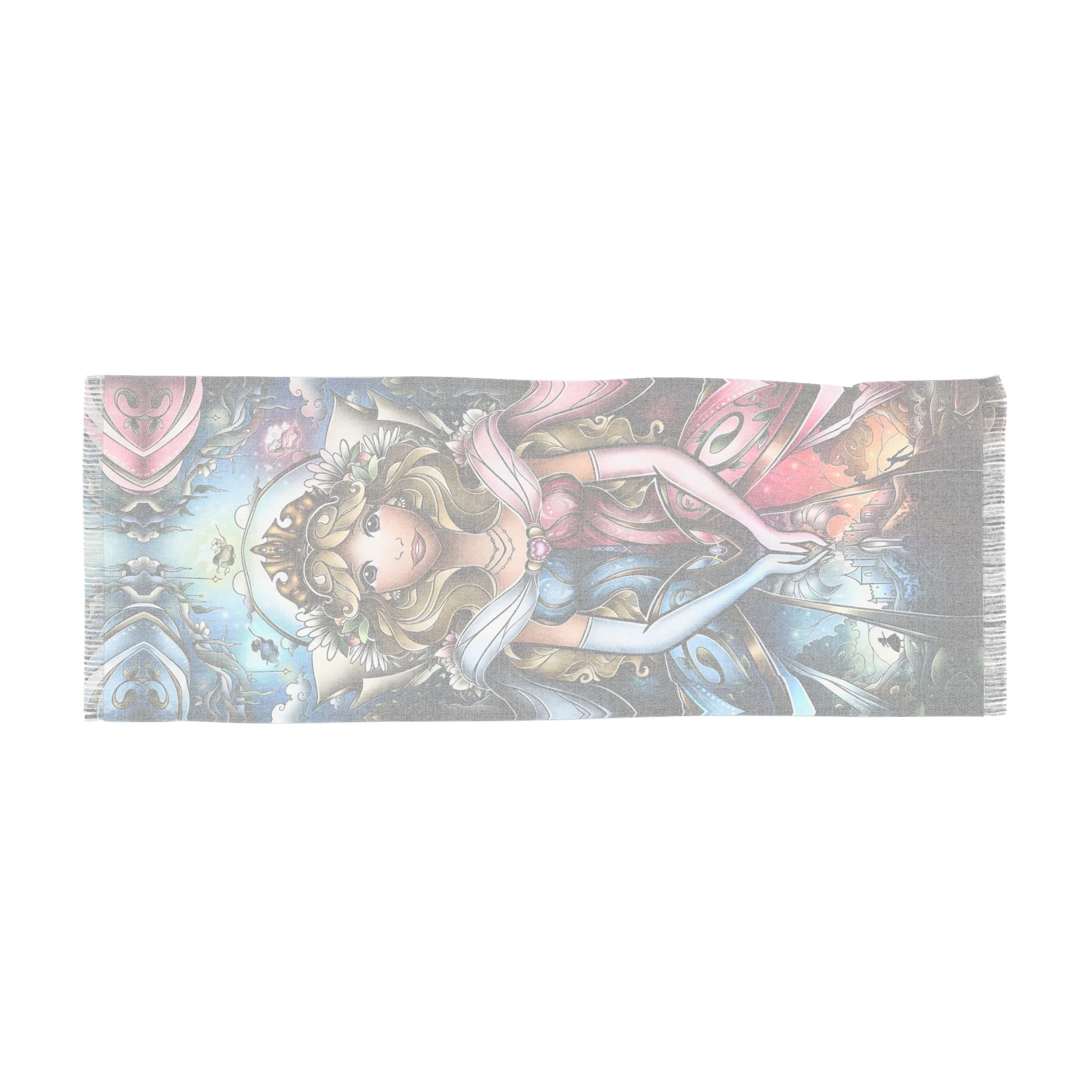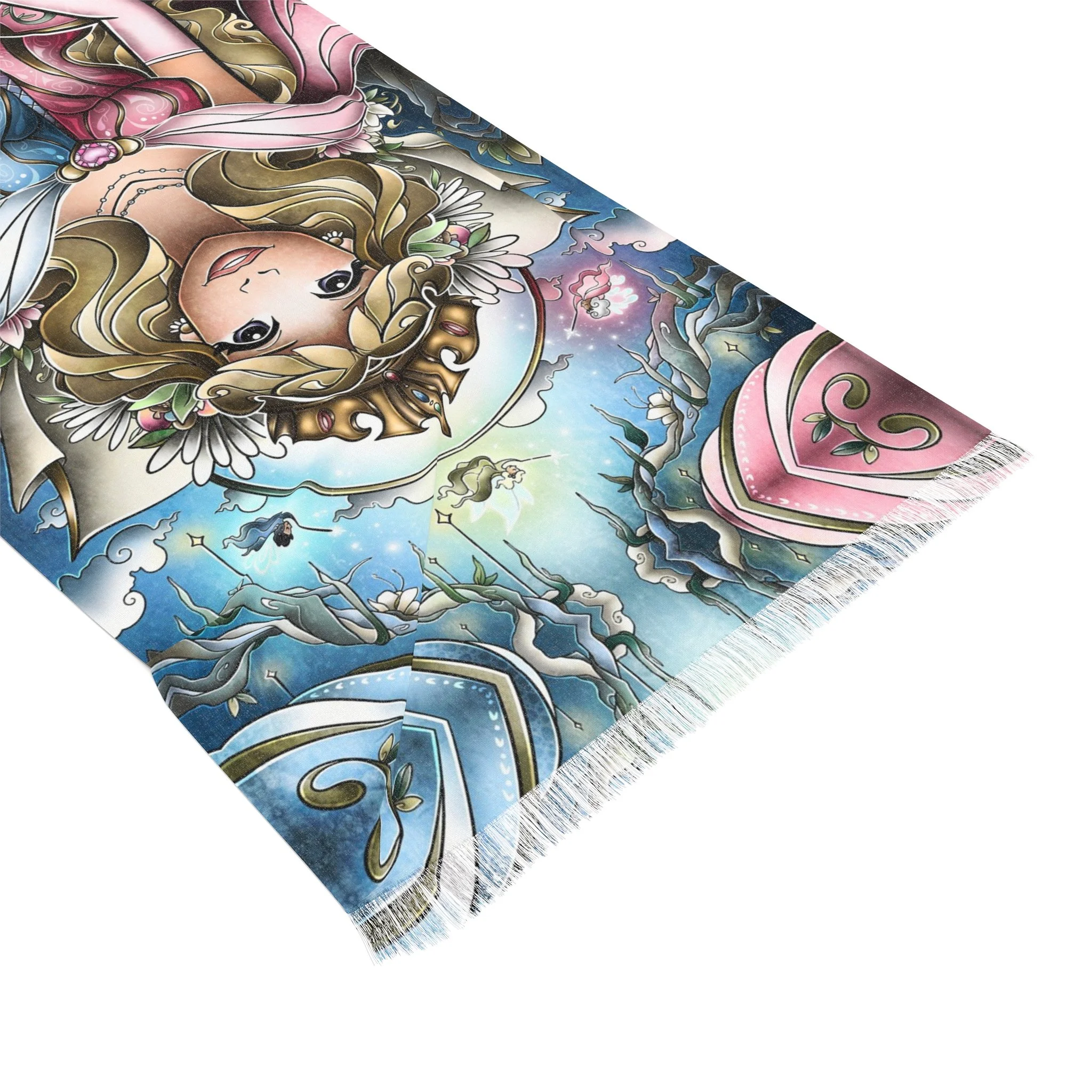 This lightweight scarf carries a painterly retelling of Sleeping Beauty’s enchanted moment, where three fairy godmothers converge in soft, luminous strokes. Draped around the shoulders it reads like a pocket of story—muted highlights shift as you move, the semi-translucent print giving a whispered double-exposure effect. The scarf feels airy against the skin and moves like a curtain of color, bringing a touch of timeless fantasy to everyday outfits. Wear it with a simple coat or a linen dress to add a quietly whimsical layer; its durable polyester weave keeps the imagery sharp and the fabric resilient, so the tale travels with you through seasons and occasions like winter gatherings, daytime theatre visits, or cozy story-night rituals.