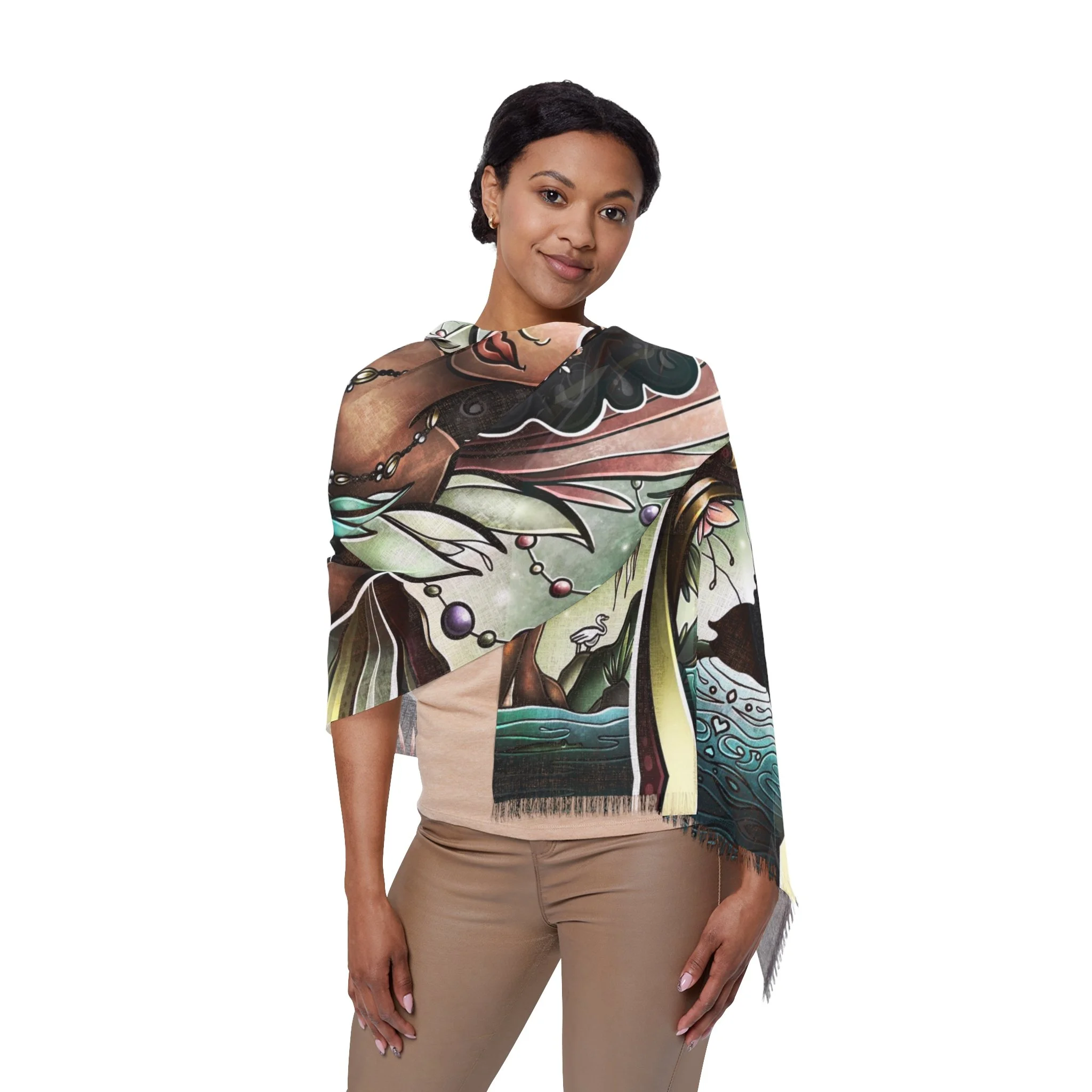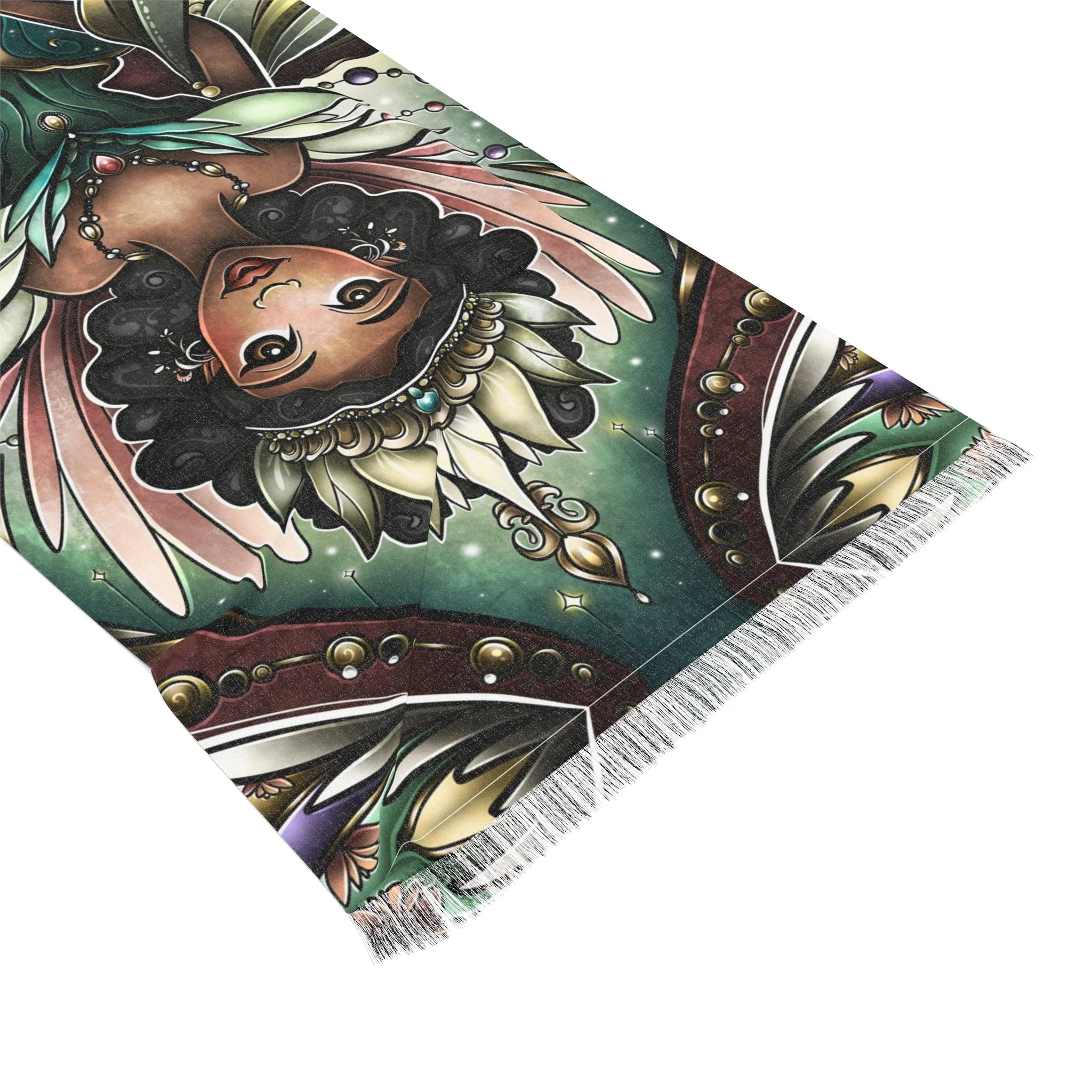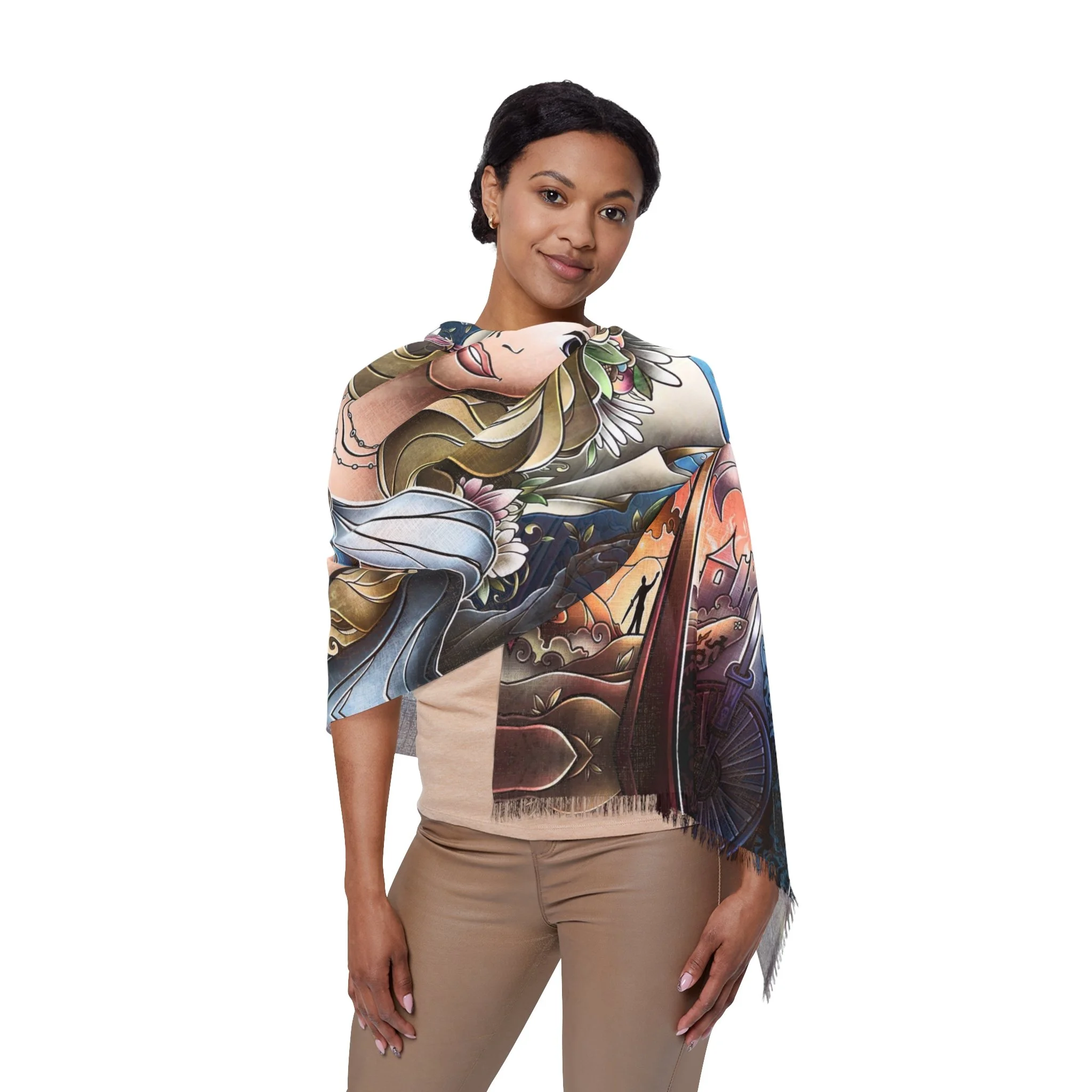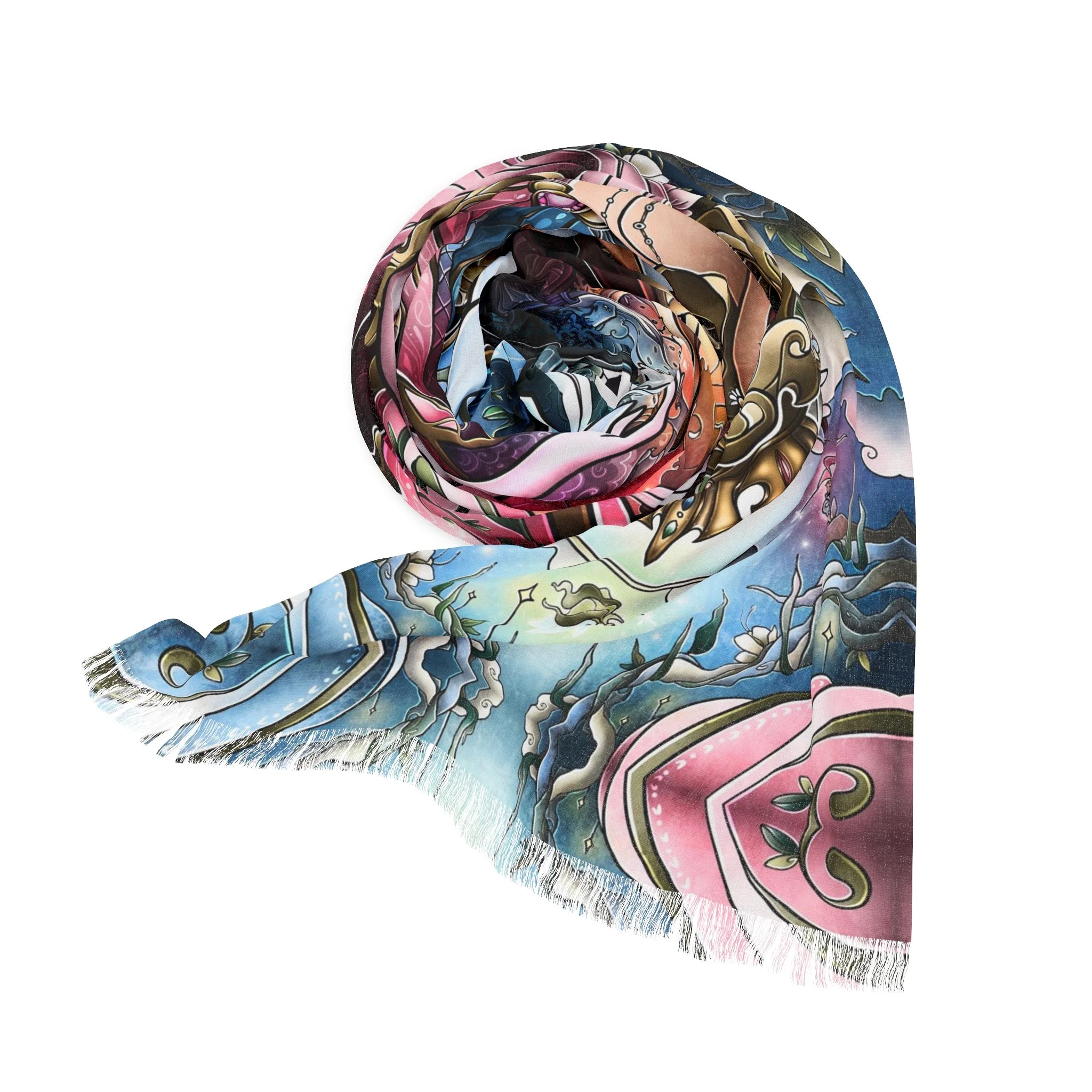 This lightweight scarf carries a painterly retelling of Sleeping Beauty’s enchanted moment, where three fairy godmothers converge in soft, luminous strokes. Draped around the shoulders it reads like a pocket of story—muted highlights shift as you move, the semi-translucent print giving a whispered double-exposure effect. The scarf feels airy against the skin and moves like a curtain of color, bringing a touch of timeless fantasy to everyday outfits. Wear it with a simple coat or a linen dress to add a quietly whimsical layer; its durable polyester weave keeps the imagery sharp and the fabric resilient, so the tale travels with you through seasons and occasions like winter gatherings, daytime theatre visits, or cozy story-night rituals.
