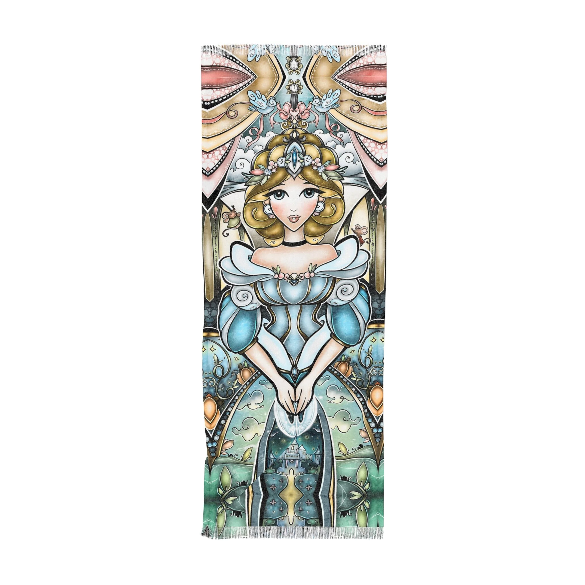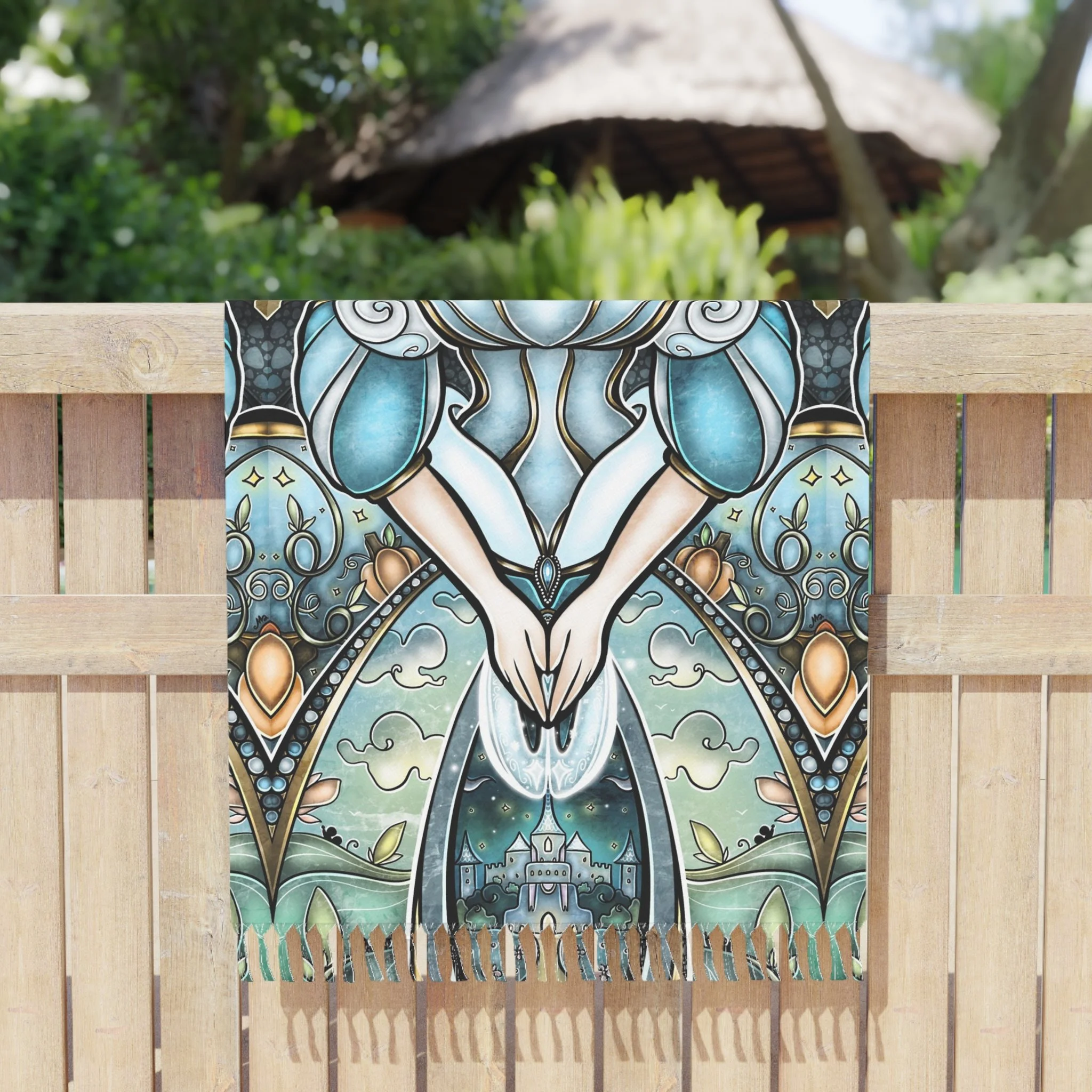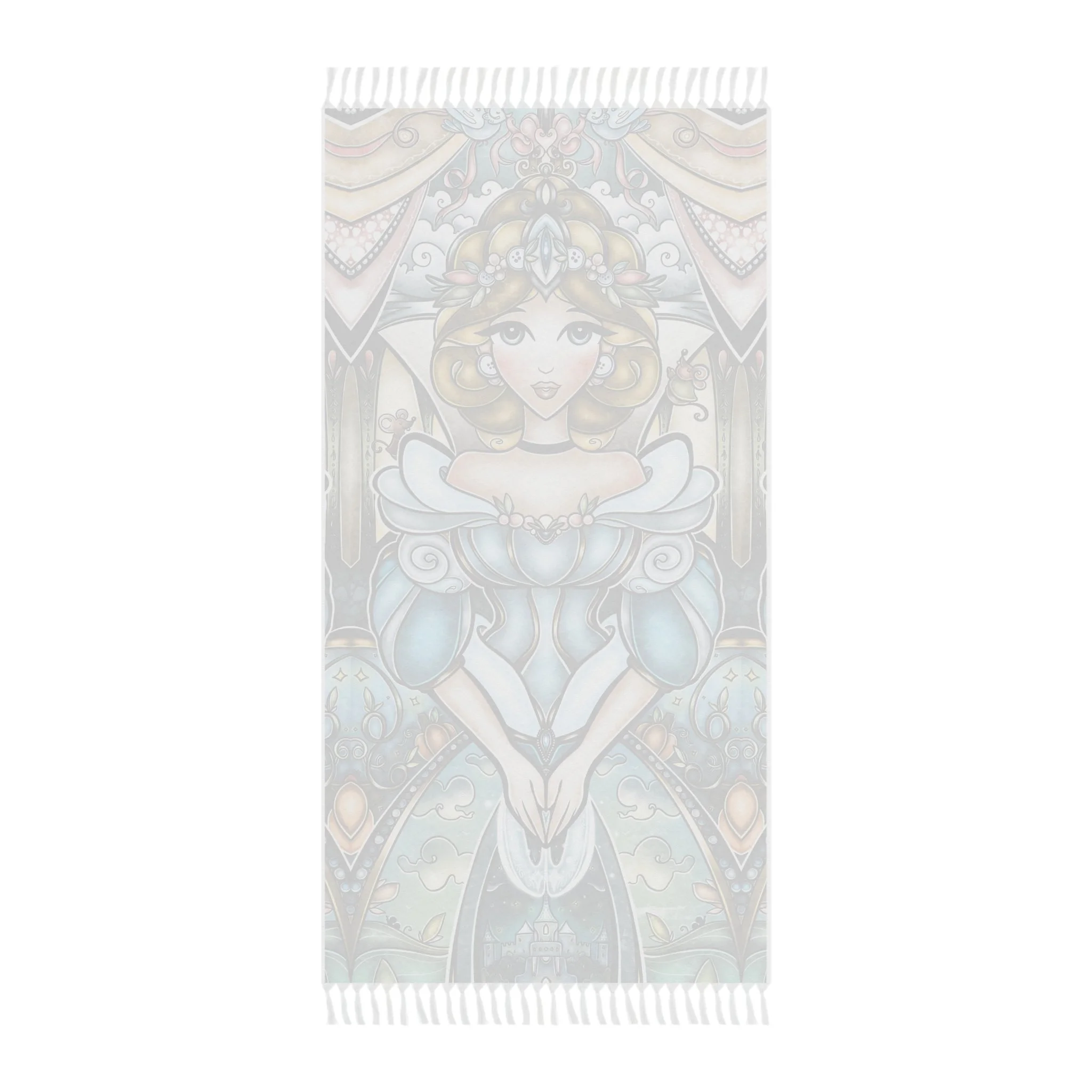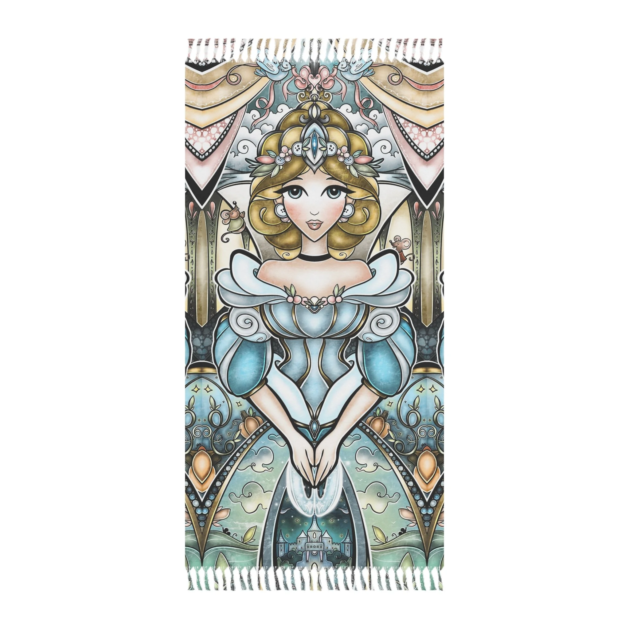 This lightweight, artful cloth brings bohemian color and story to every home, shoreline, campfire and travel moment. Printed in vivid, jewel-toned inks, the design shows Cinderella in a magical light framed by ornate, stained-glass shapes — a piece that reads like a portable tapestry. Use it as a sandy spread, quick-dry wrap, or a decorative throw when you want your space to feel curated and warm. The polyester fabric dries fast and keeps its shape while the knotted tassels add a handmade, wanderer’s touch. Carry it folded in your bag for weekend escapes, drape it over an arm chair, or lay it under the sun and watch the colors deepen as the day goes on.