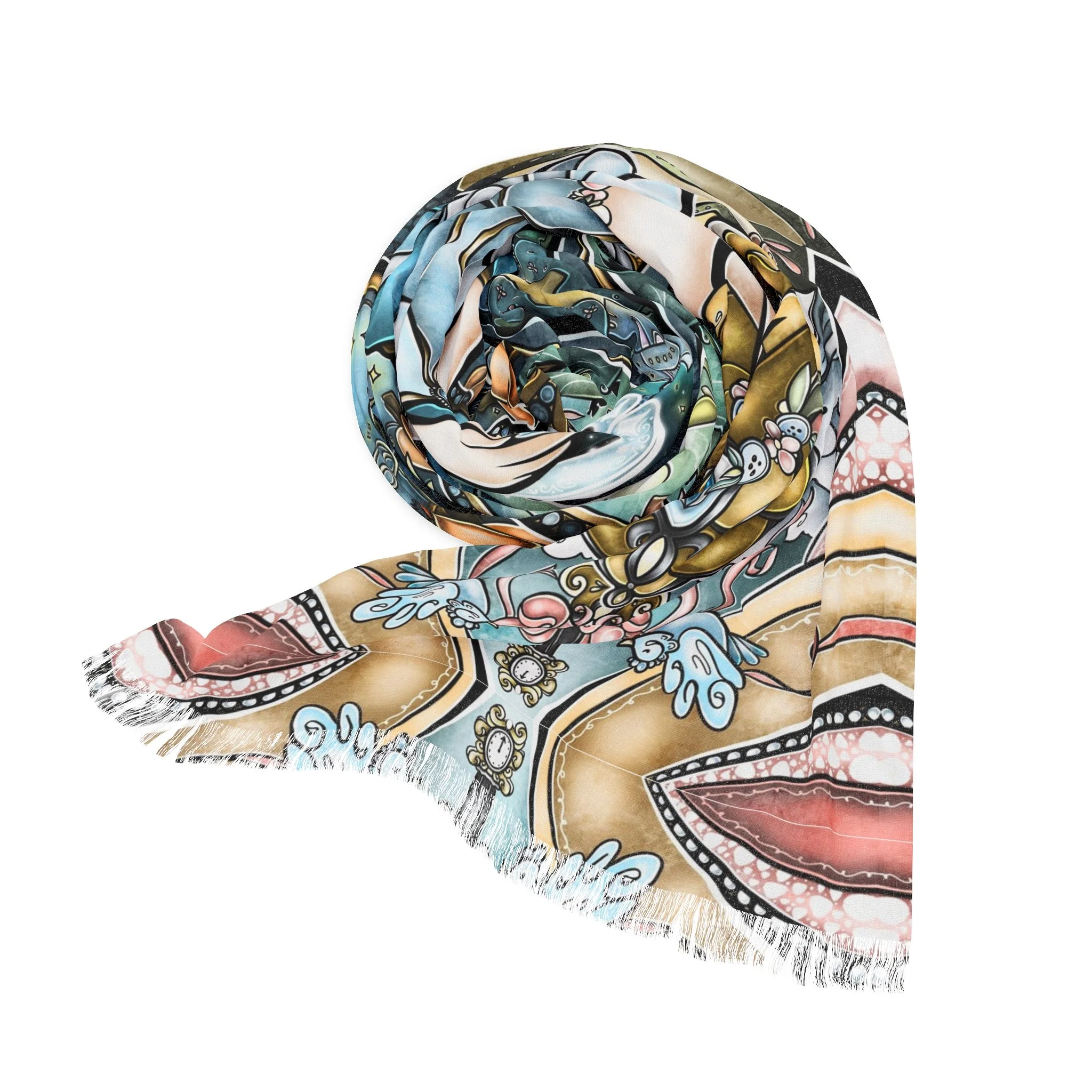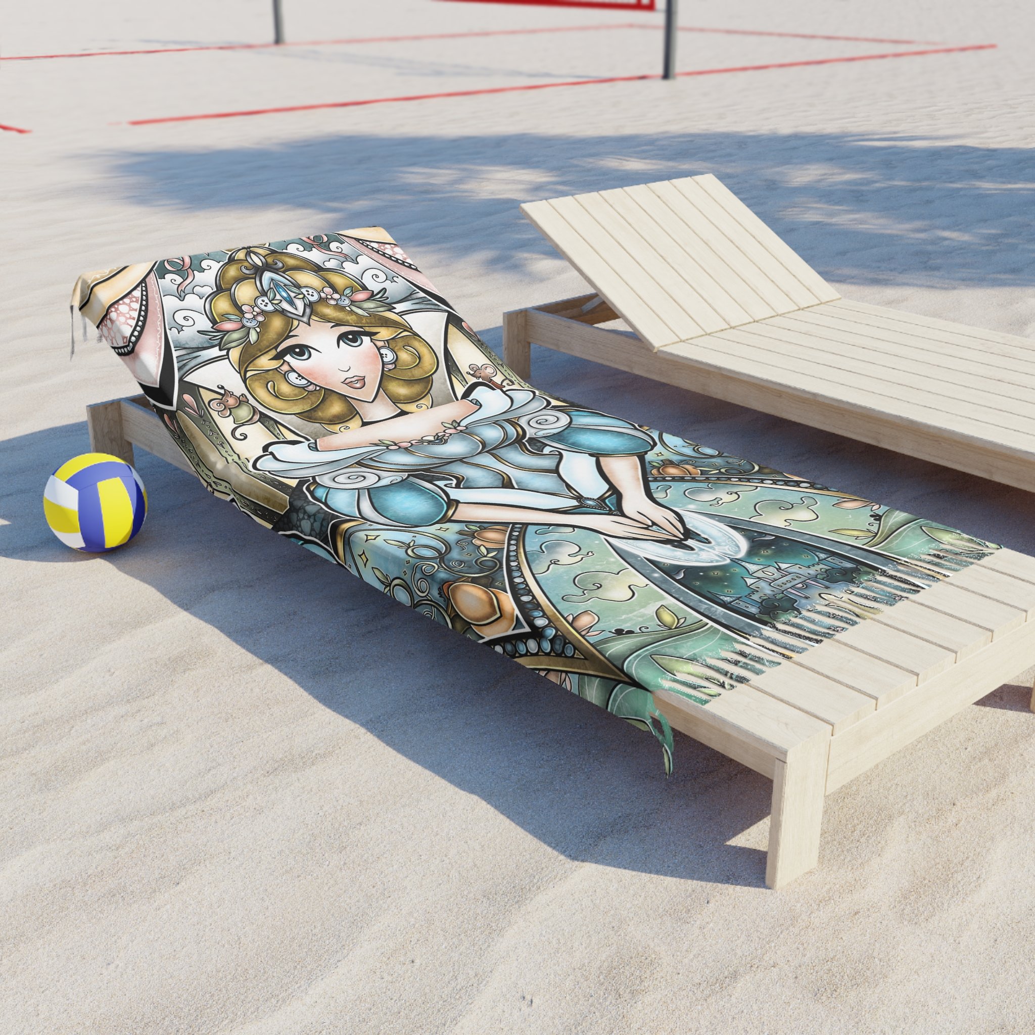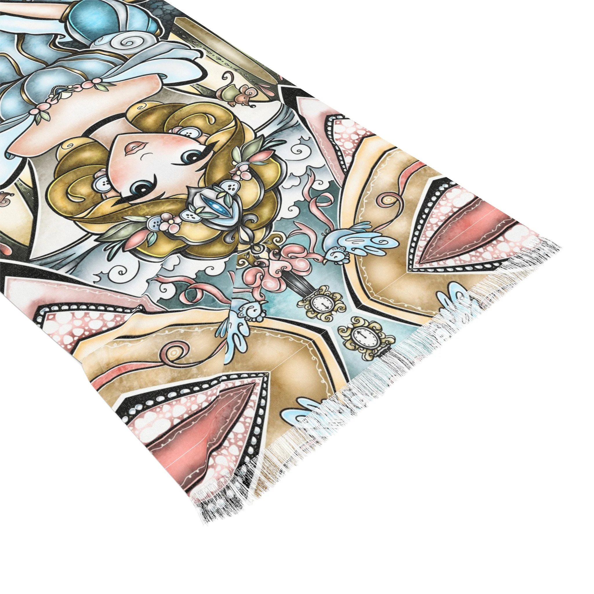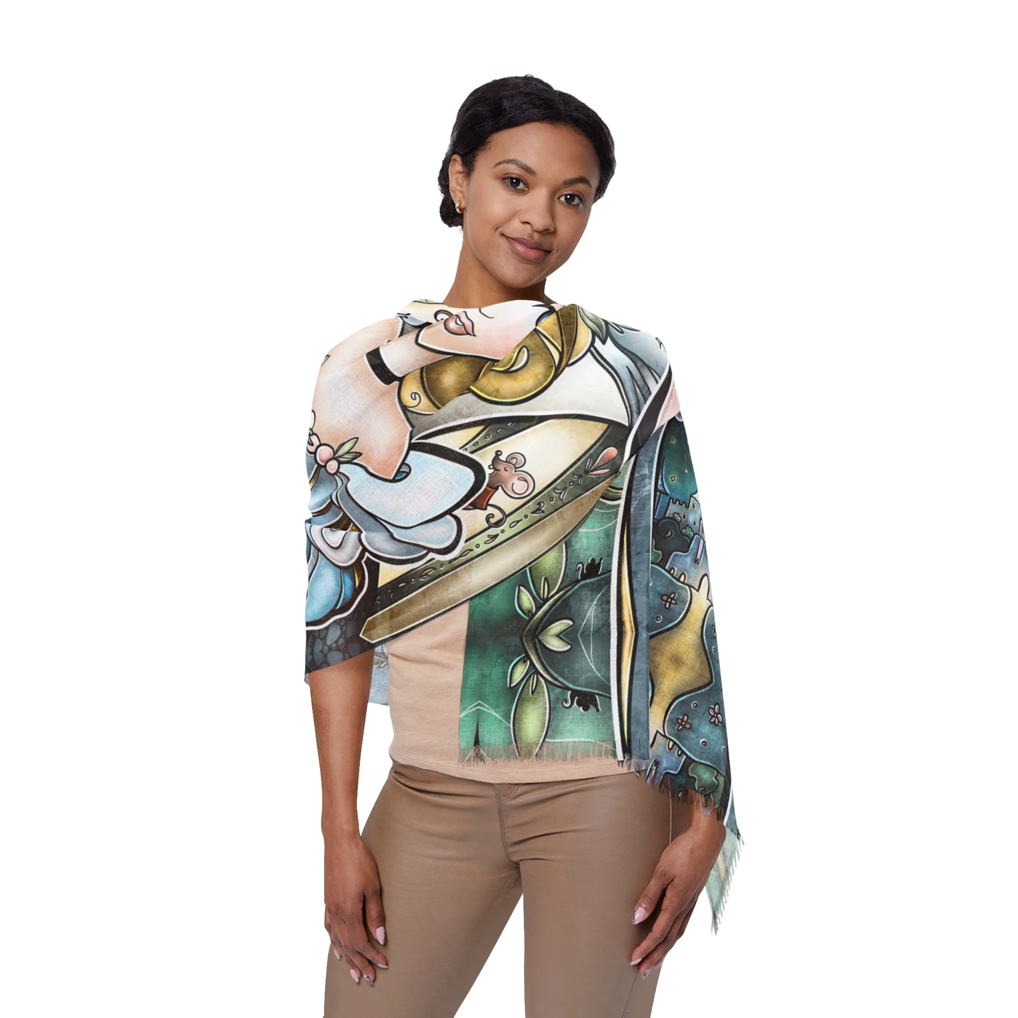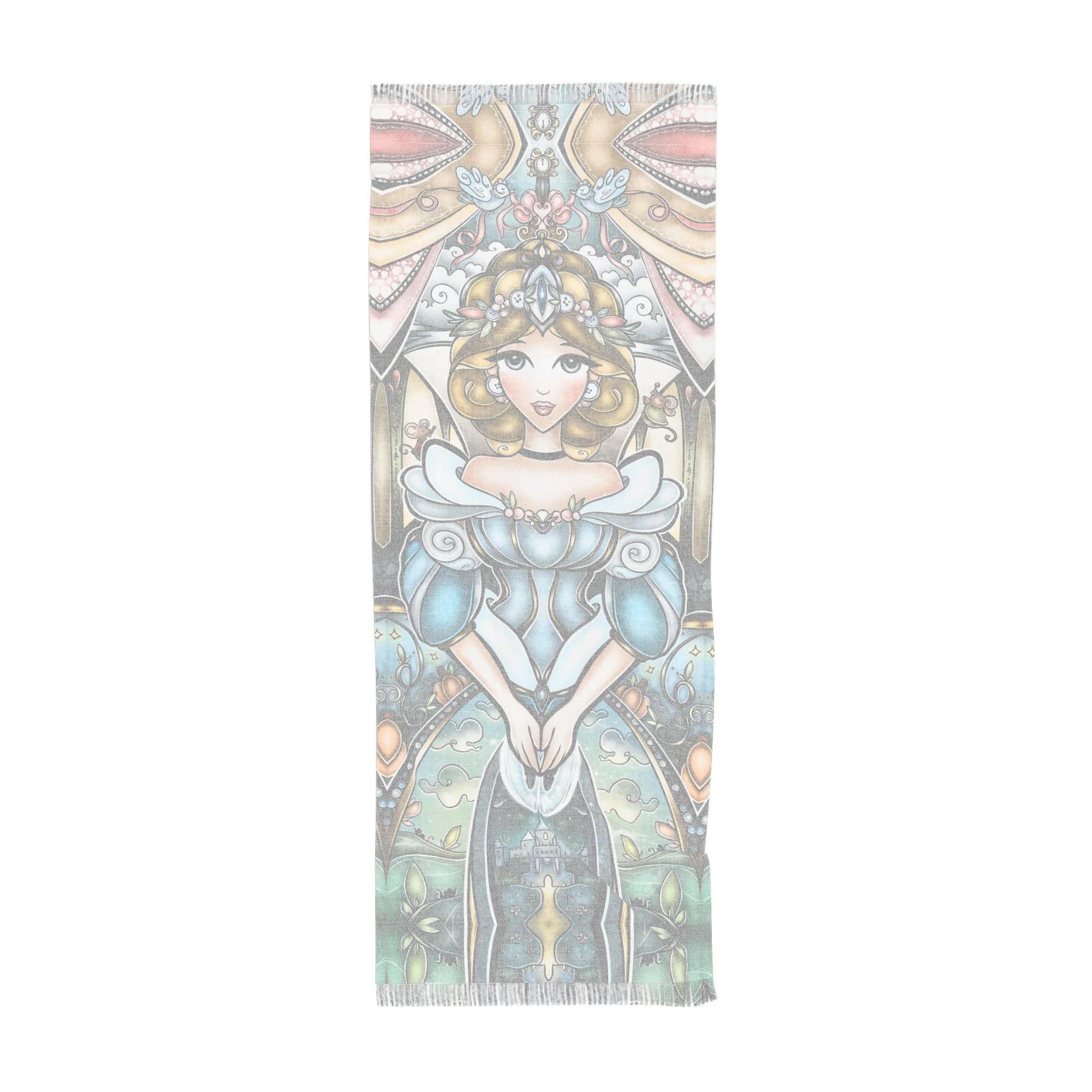 This lightweight, artful cloth brings bohemian color and story to every home, shoreline, campfire and travel moment. Printed in vivid, jewel-toned inks, the design shows Cinderella in a magical light framed by ornate, stained-glass shapes — a piece that reads like a portable tapestry. Use it as a sandy spread, quick-dry wrap, or a decorative throw when you want your space to feel curated and warm. The polyester fabric dries fast and keeps its shape while the knotted tassels add a handmade, wanderer’s touch. Carry it folded in your bag for weekend escapes, drape it over an arm chair, or lay it under the sun and watch the colors deepen as the day goes on.